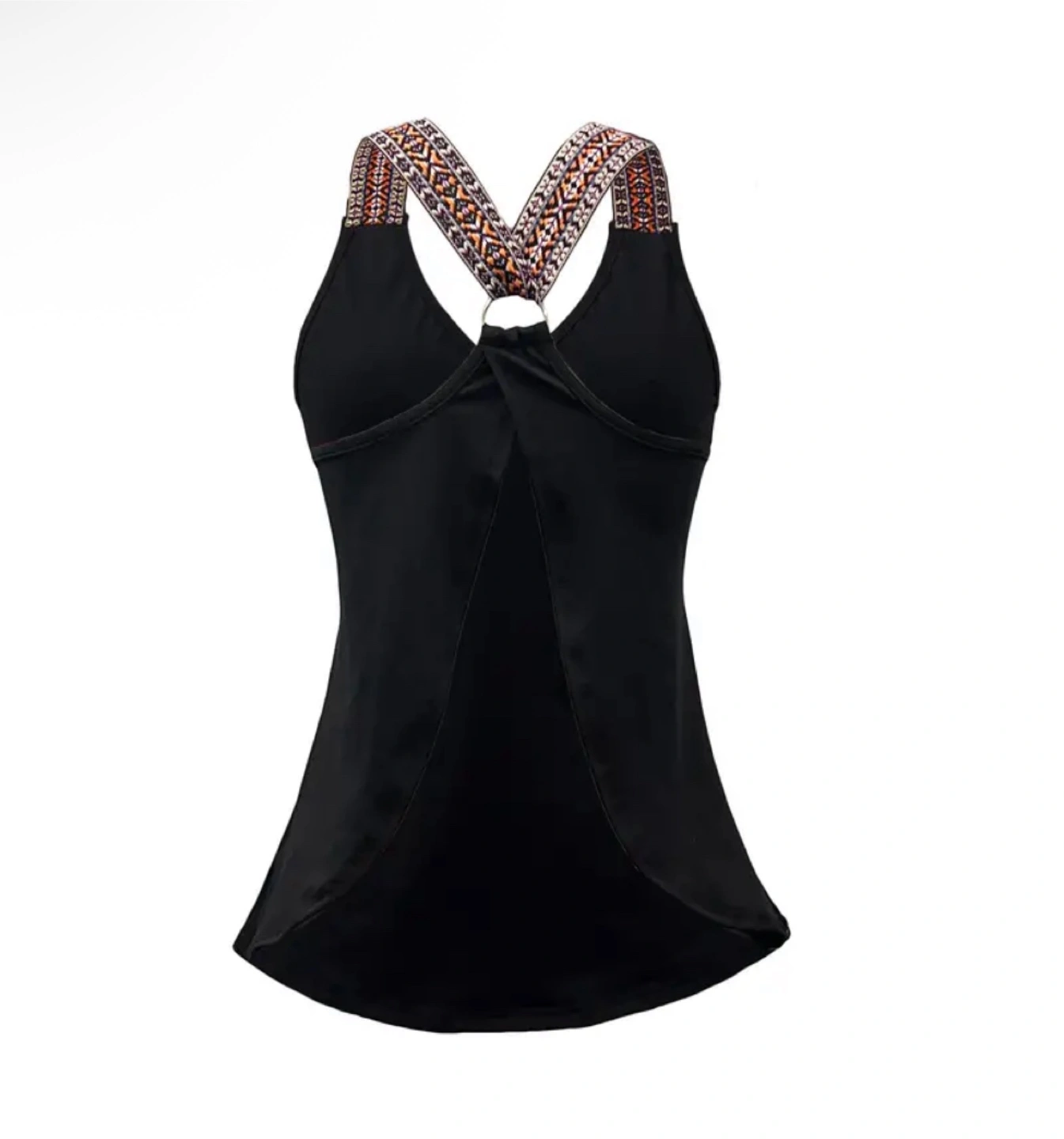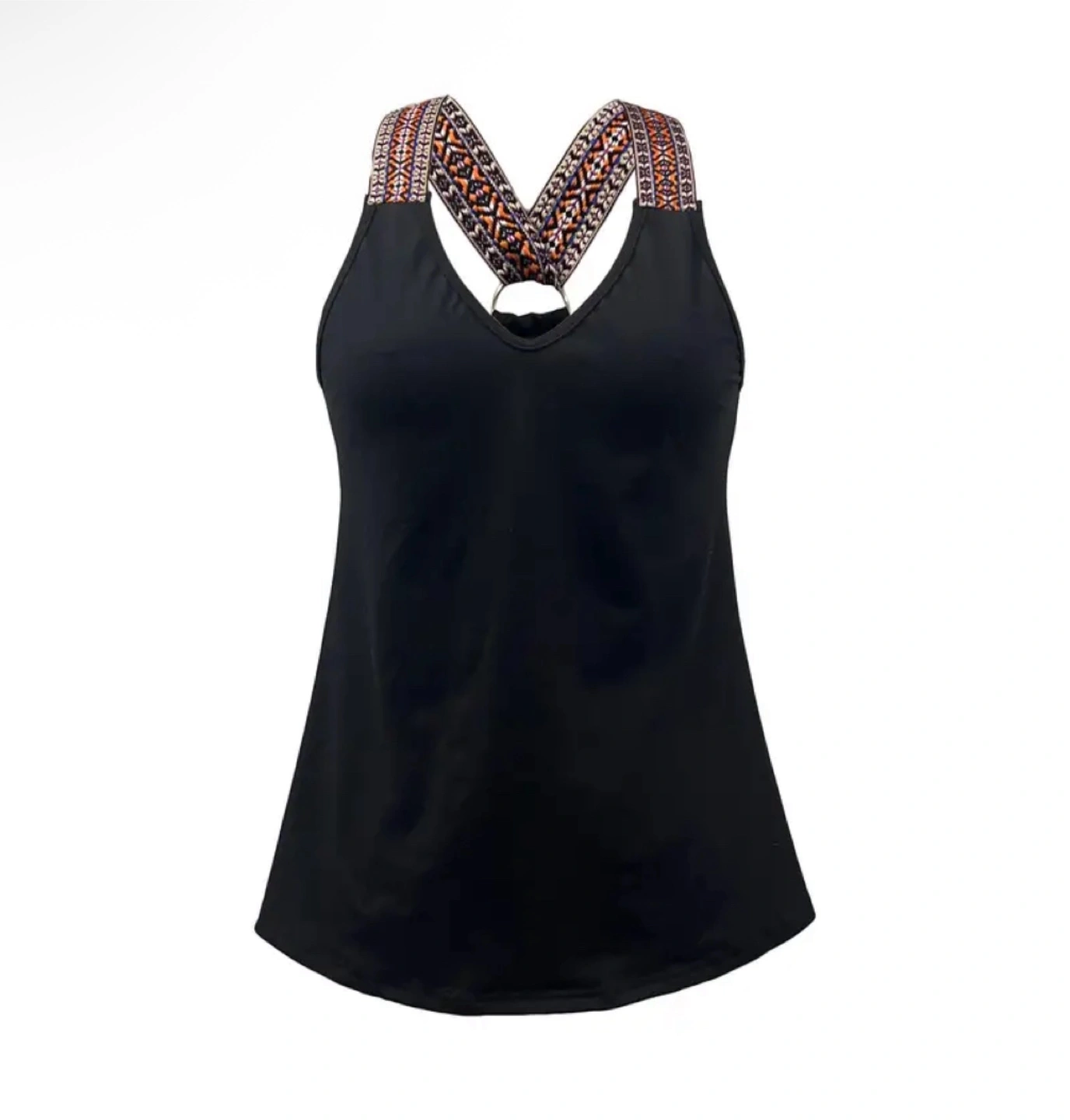 This stylish black tank top features an open-back design with elegant embellishments, making it a standout piece for any occasion. The sleeveless cut offers a comfortable fit, perfect for warm weather or layering under jackets. Its chic and modern style ensures you look effortlessly fashionable. Size XL