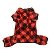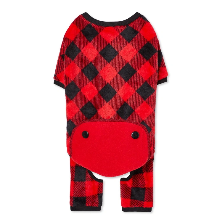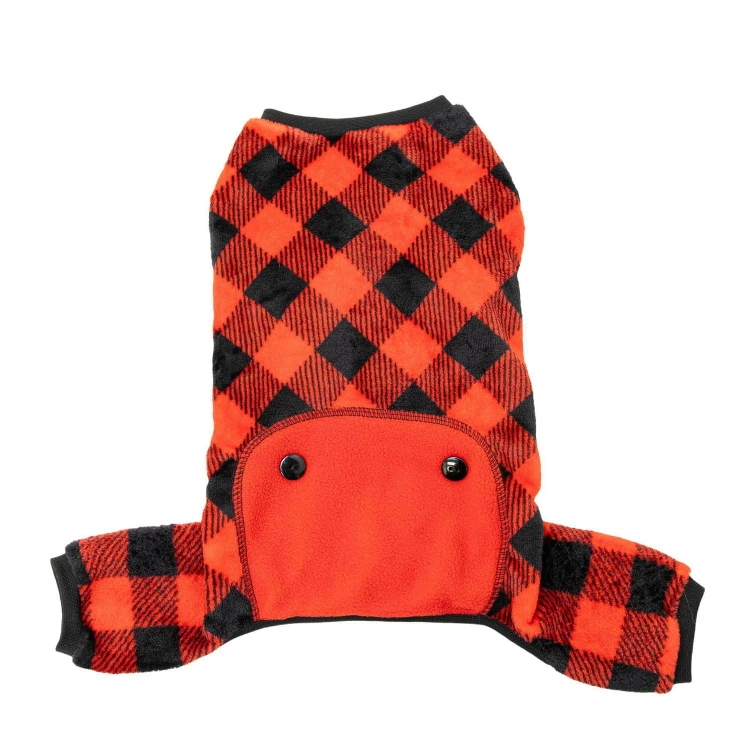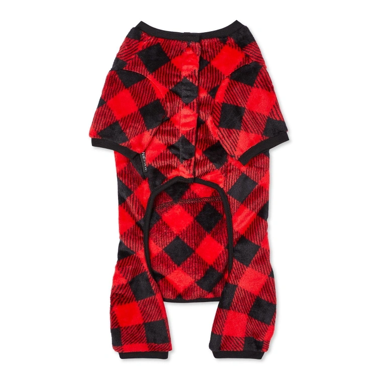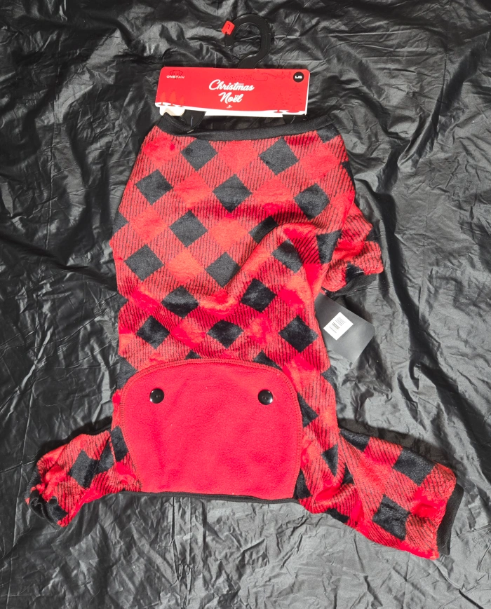 A cozy red and black plaid dog pajama. Features a unique red patch. A fantastic item to keep your furry friend warm and snug during those cold nights.