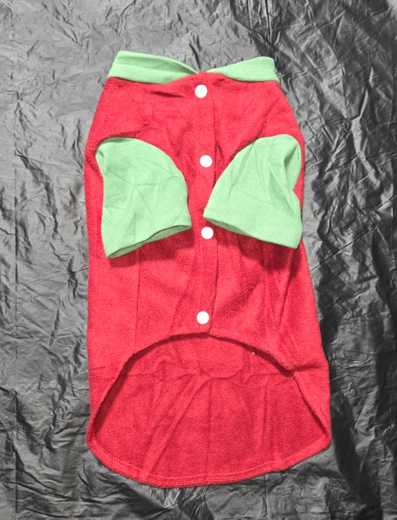 A colourful dog coat. Red body, with green accents. Features buttons along with a loop. Perfect for keeping your furry friend comfortable, especially when the weather turns chilly.