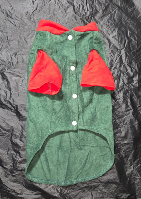 A charming green and red dog winter coat. Features a red collar and arm cuffs.