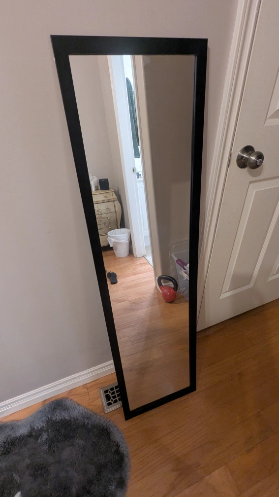 A long, rectangular mirror. The frame is black. Great for a full body view before heading out for the day. length 125cm width 35cm