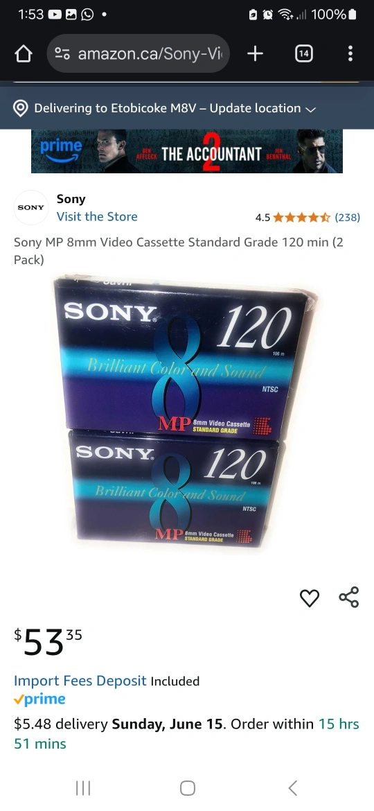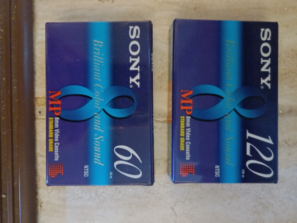 2 NEW SEALED: These Sony 8mm video cassettes offer brilliant colour and sound. 120 minutes. Amazon.ca price shows $53.00 - screenshot included in photos