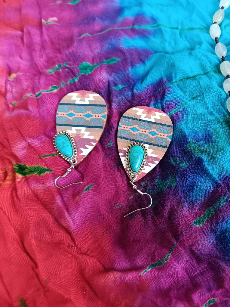 Earrings with a unique shape. Feature a decorative, patterned surface and a turquoise-colored stone. The hook is attached to the earrings. Perfect to add a little bit of colour to your day.