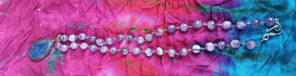 A beautiful necklace. Features two strands of purple gemstone beads. Comes with a large blue pendant. A great item to wear when you want to feel at peace.