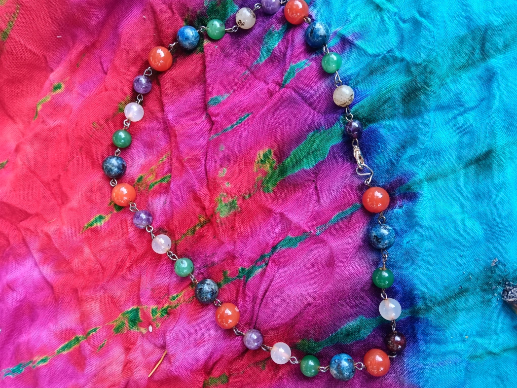 A colourful beaded necklace. Featuring round, various coloured beads. Connected by a delicate chain. You might find that this necklace is perfect to wear while meditating.