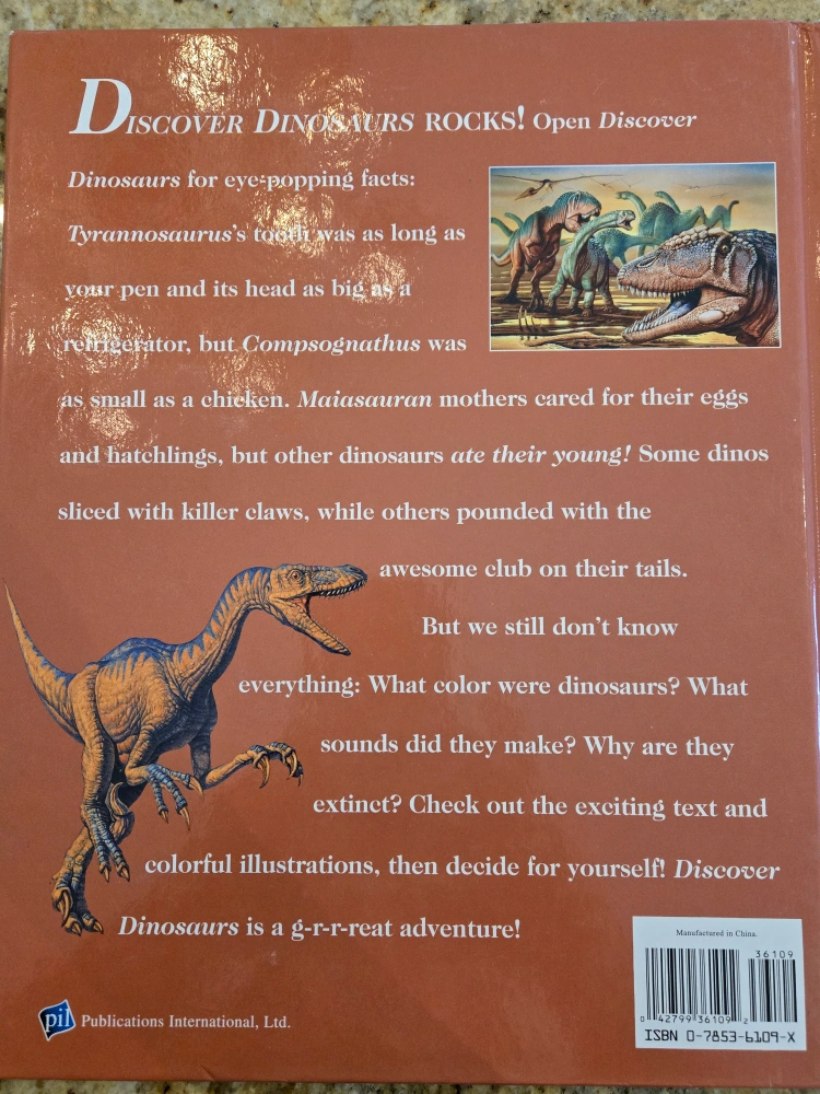 A book that will teach you about dinosaurs. It features illustrations and interesting facts. Imagine cozying up with this book on a rainy afternoon to escape into a world of ancient creatures.