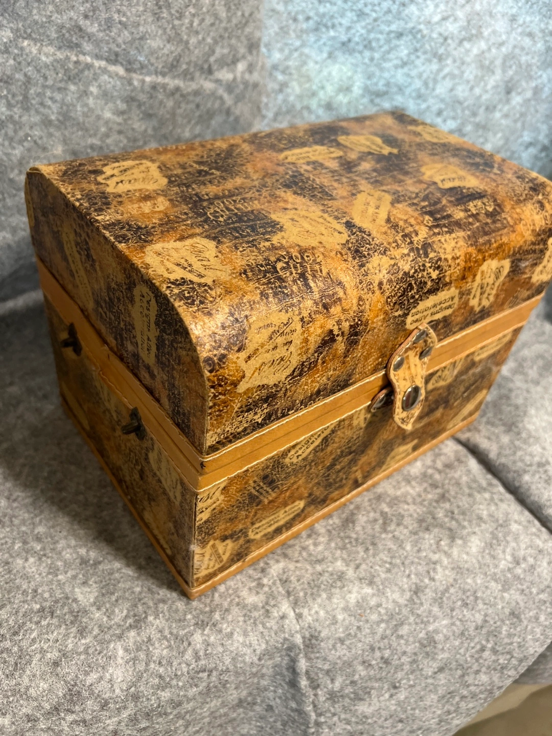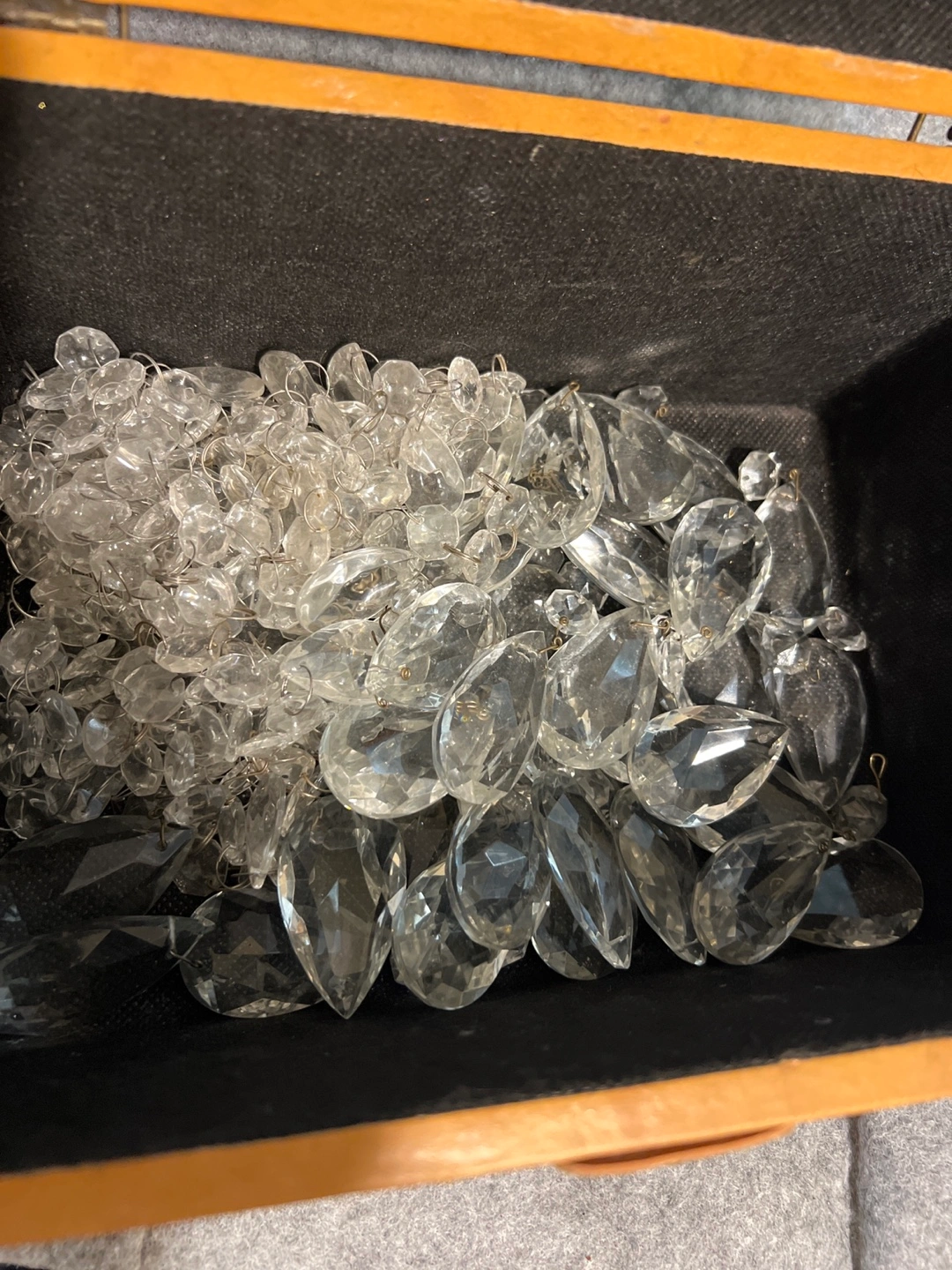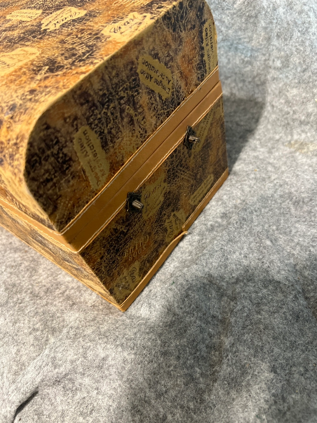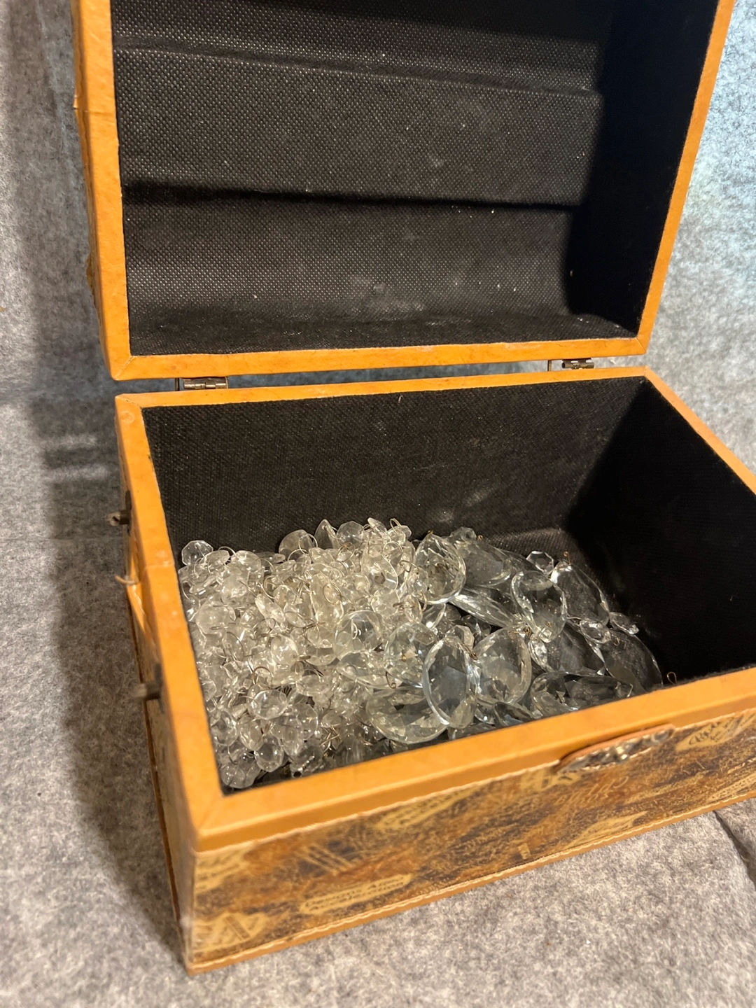 Features a decorative box, complete with a unique design. Its exterior showcases an array of markings, while the box is secured with a latch closure. The interior is filled with a collection of clear, decorative crystals. It's ideal for keeping small treasures or trinkets
