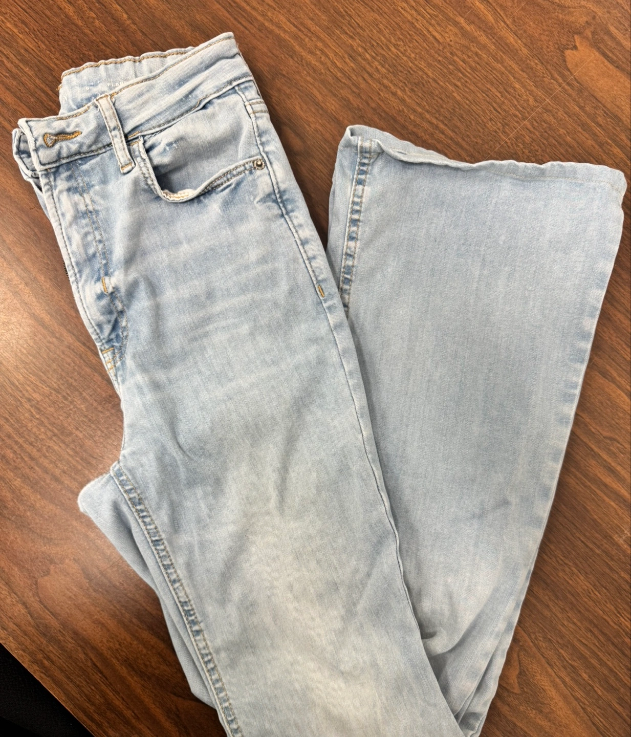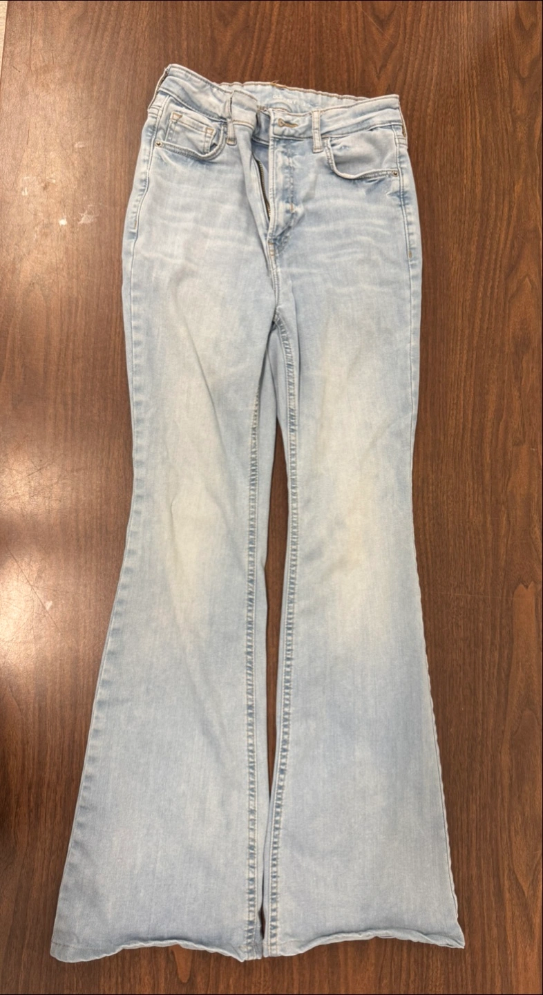 Light wash denim jeans. Flare leg style. Button and zipper closure. Perfect for a relaxed and effortless outfit.