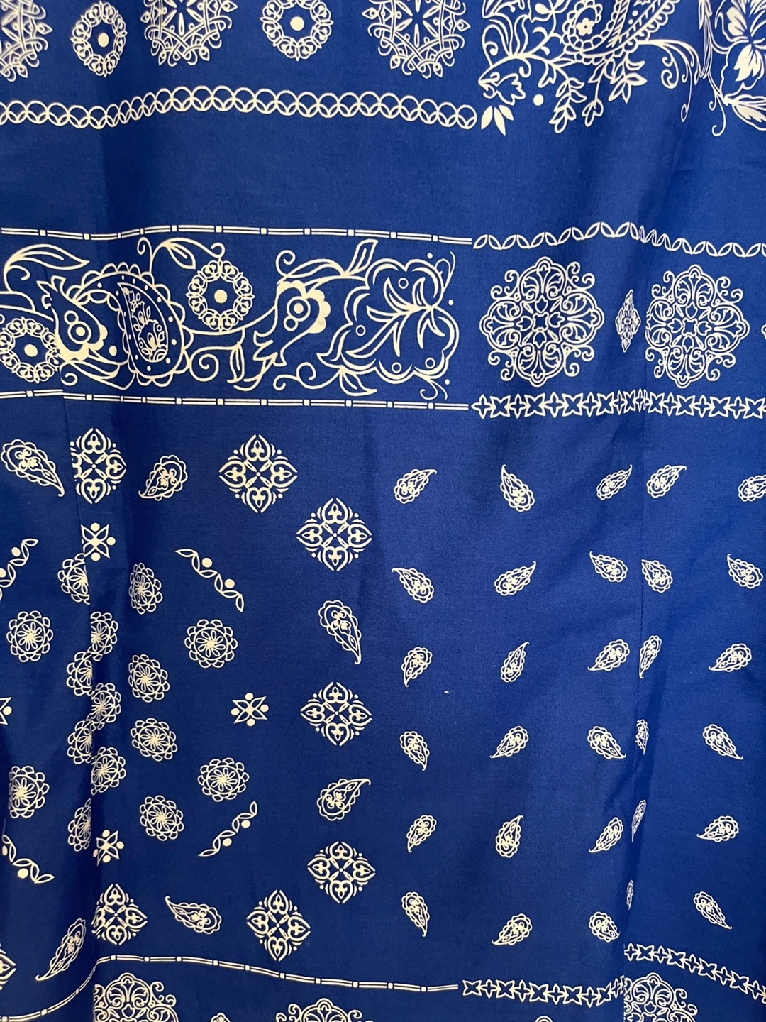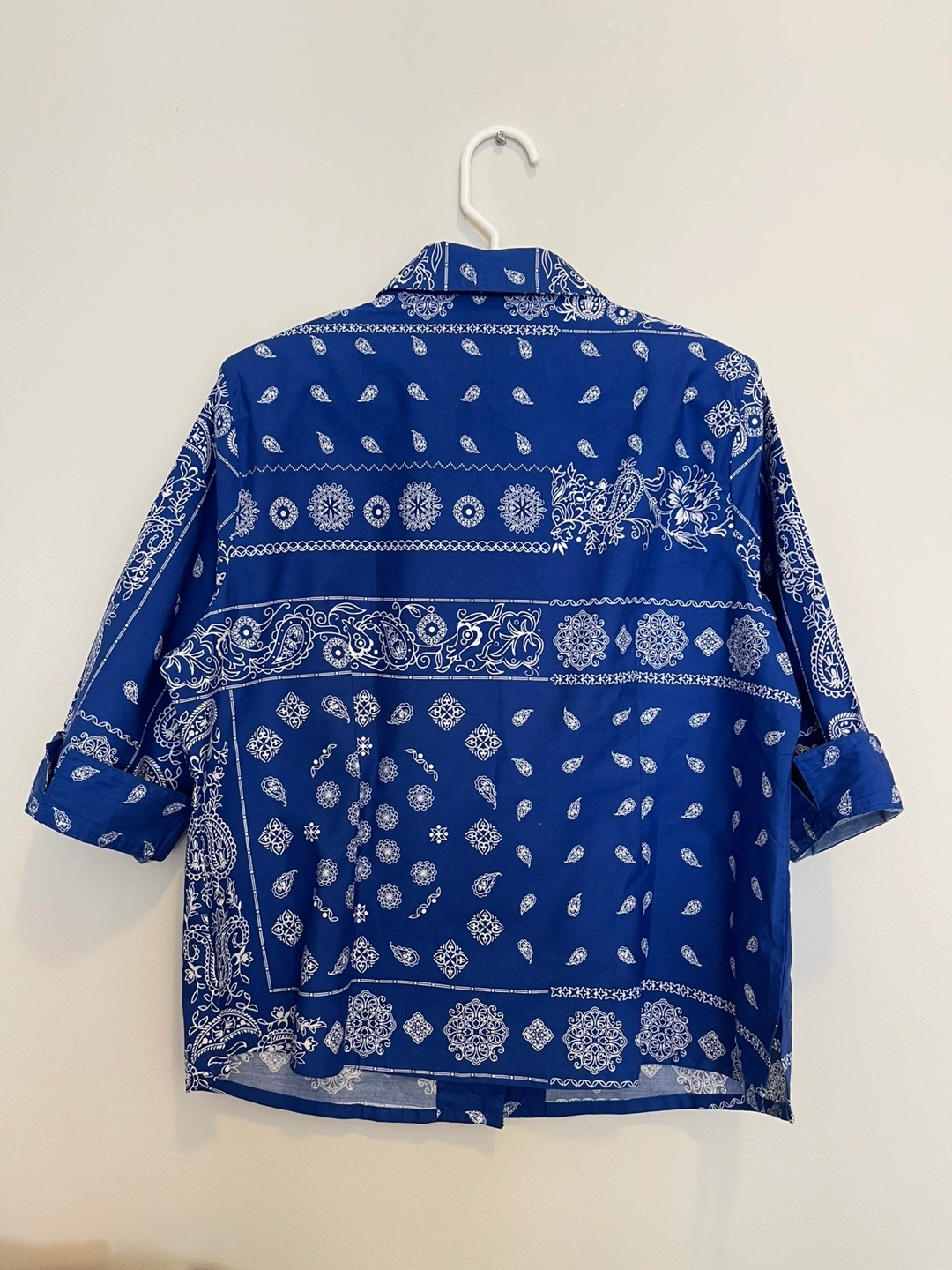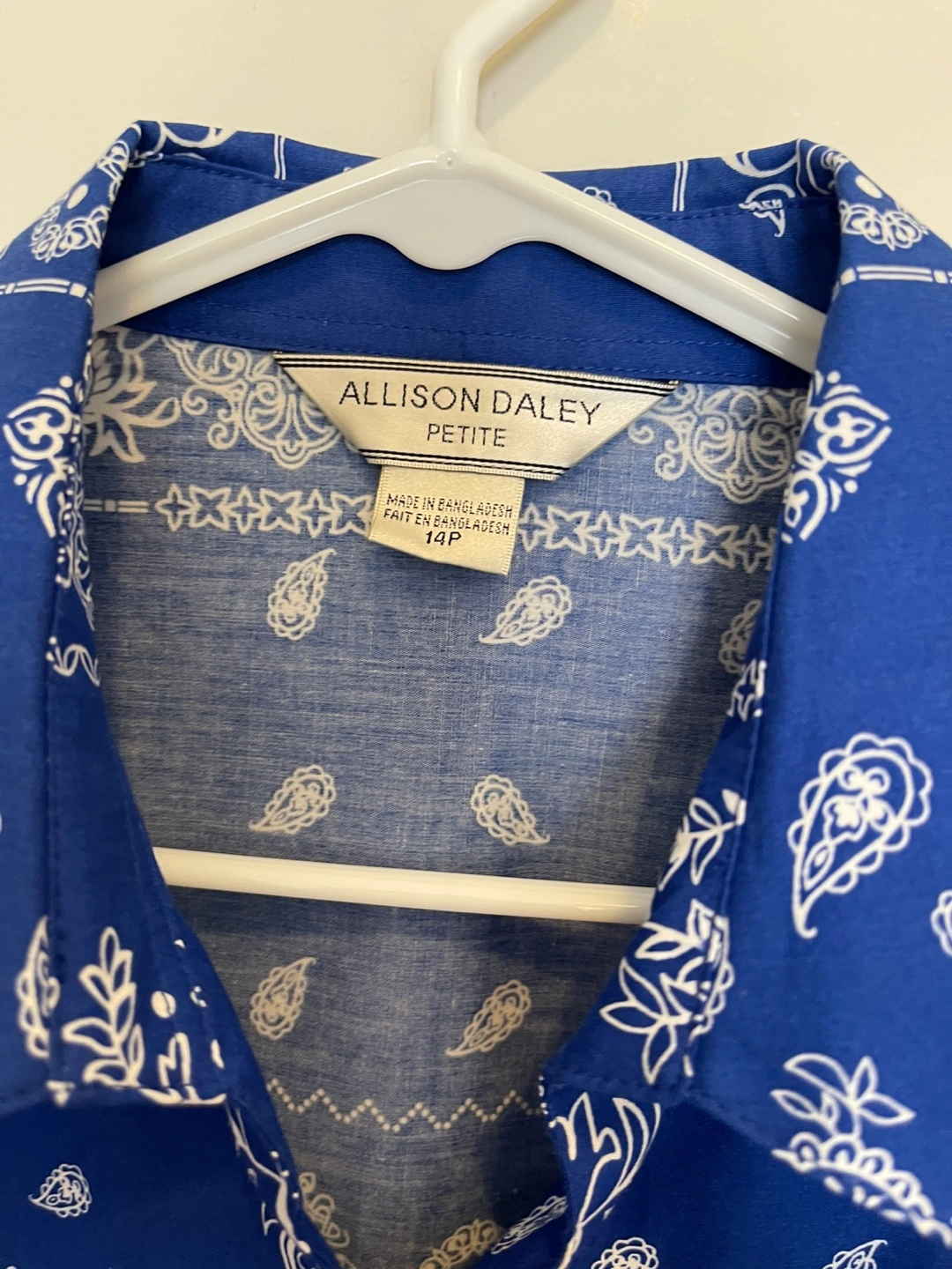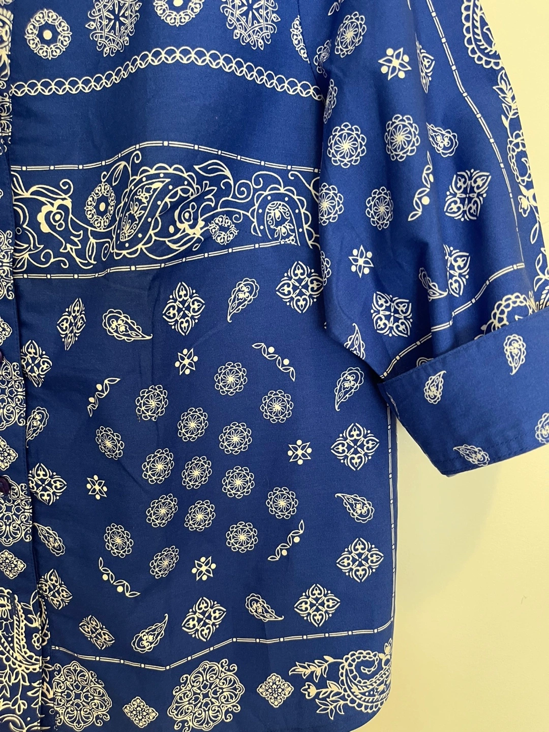 Blue button-up top. White paisley details. Three-quarter sleeves. A perfect choice for those days when you want to look stylish and feel good about yourself. 14P ( petite)