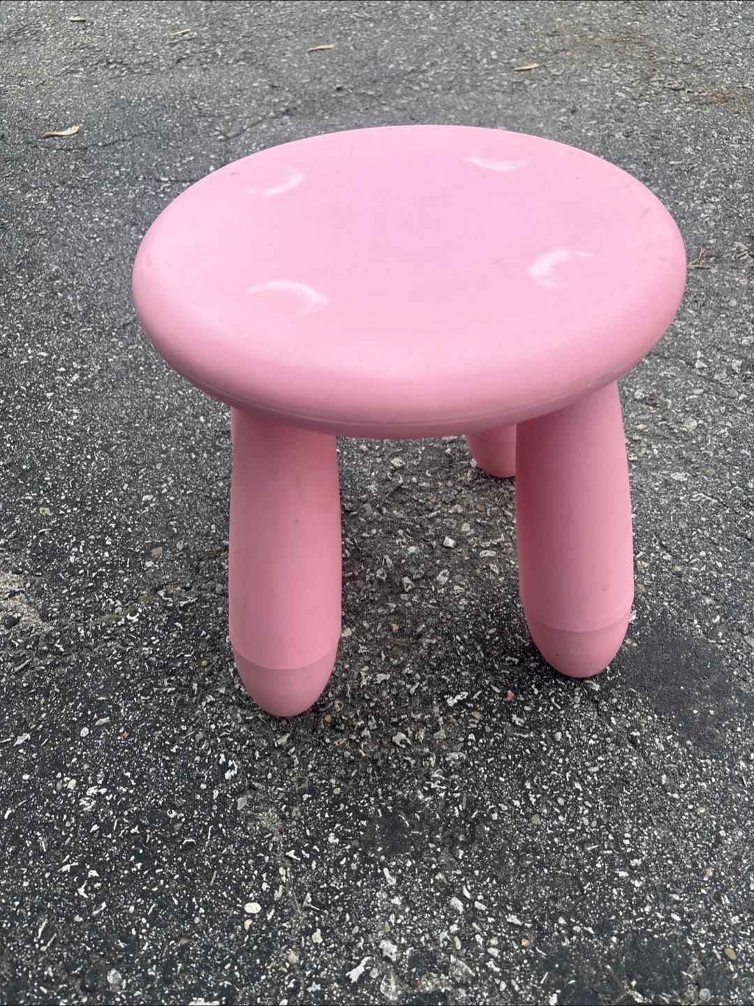 A cute, pink stool. Features a mushroom shape. Could be great to use for indoor play. This would make a wonderful addition to a child's space. I have six. Six for $25