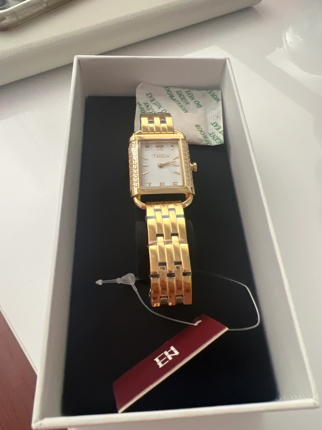 A beautiful gold watch still in its original box. The watch features a rectangular face with a bright white dial. The watchband has a similar color to the watch case. Wearing this watch can help make a great first impression. Never used. Box packed