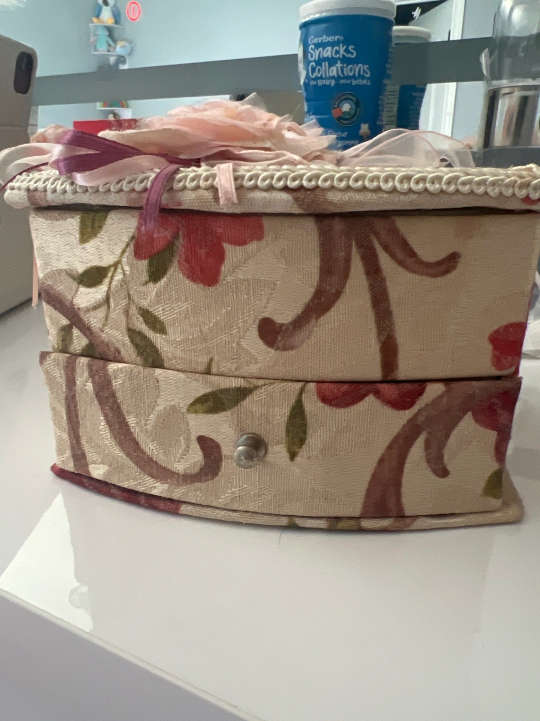 Lovely jewelry box with a floral print. The box has a pull-out drawer. Features a mirror inside with compartments. A relaxing space to store your favourite items.