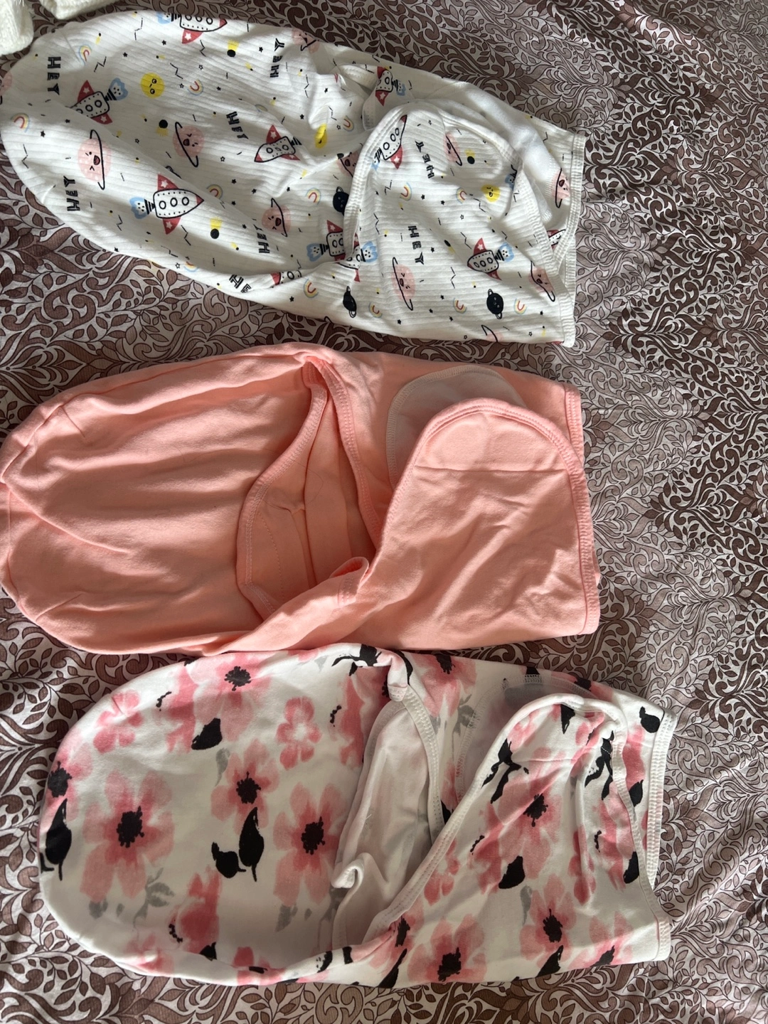 Offering three adorable baby swaddles, each with a unique design. One features a charming space-themed print, another is a soft pink, and the last has a lovely floral pattern. These swaddles offer comfort and ease for both baby and parent. Never used. 5$ each total set of 3