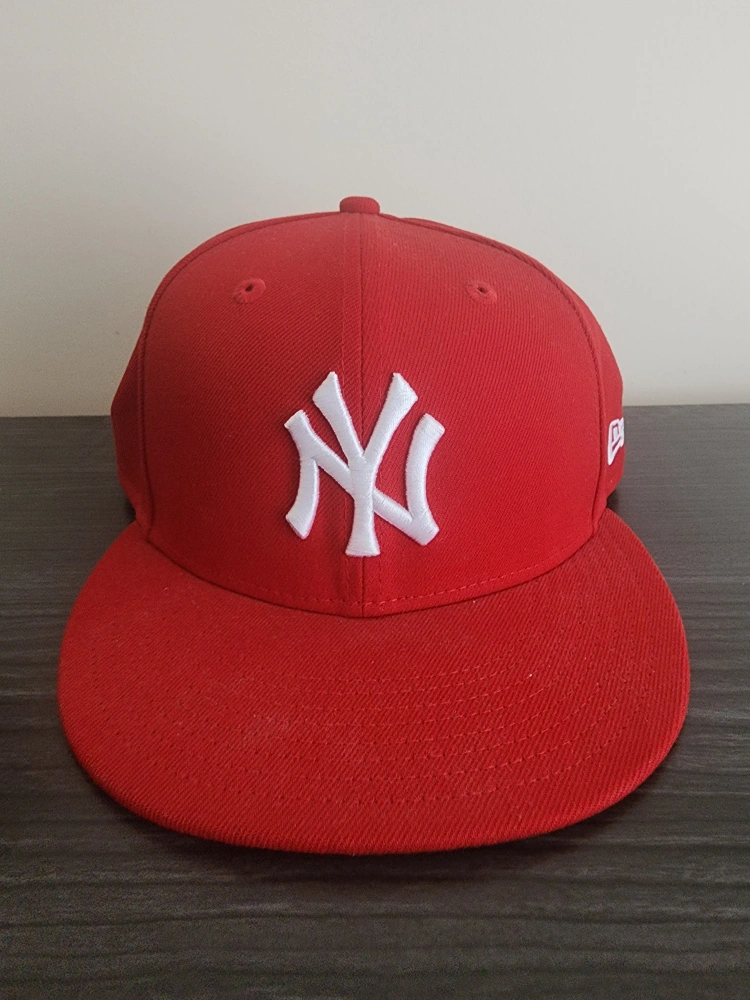 The cap is red with the classic NY logo embroidered on the front. The brim is flat and the cap appears to be in good condition. This cap is the perfect accessory for a sunny day. Was meant to be a gift but I got the wrong hat.