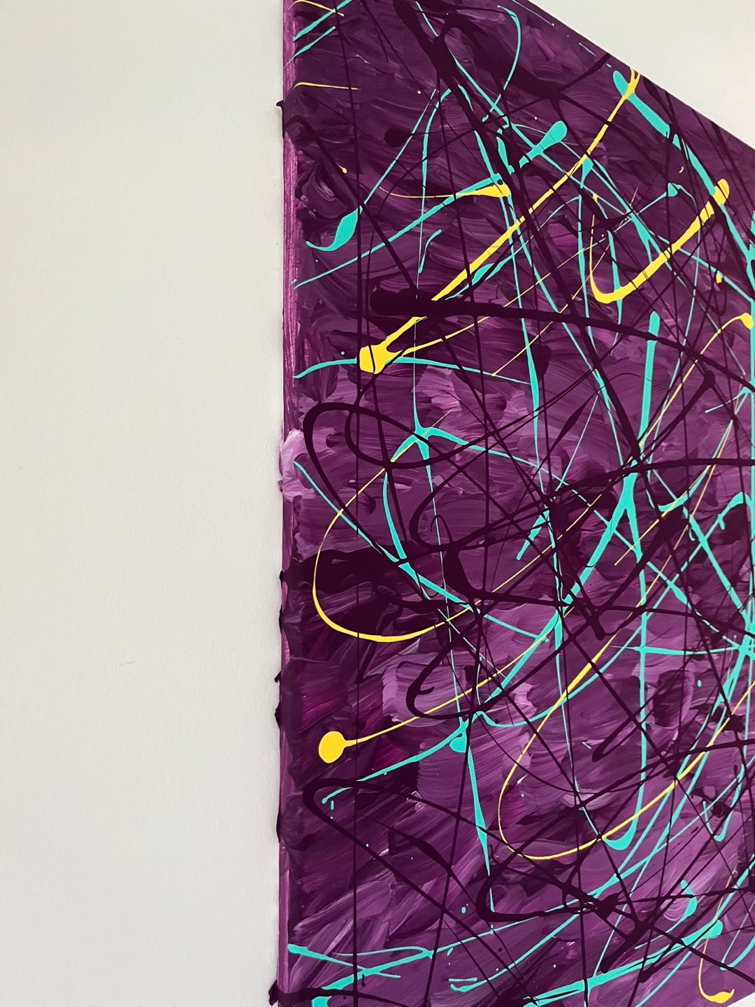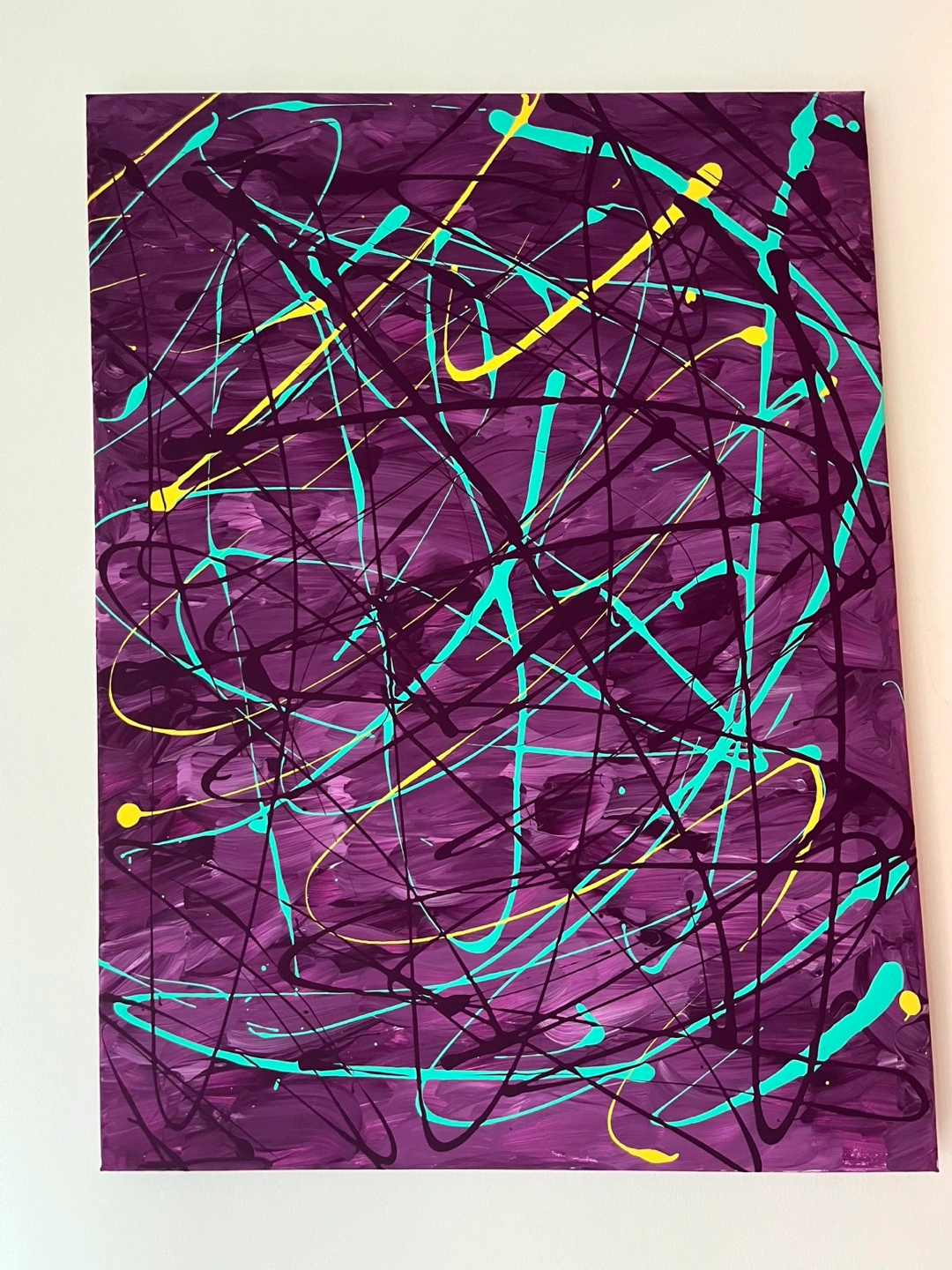 Painted on canvas. Features various colours like purple, yellow and teal . Great for enhancing the look of a living room. Cash and pickup only please.