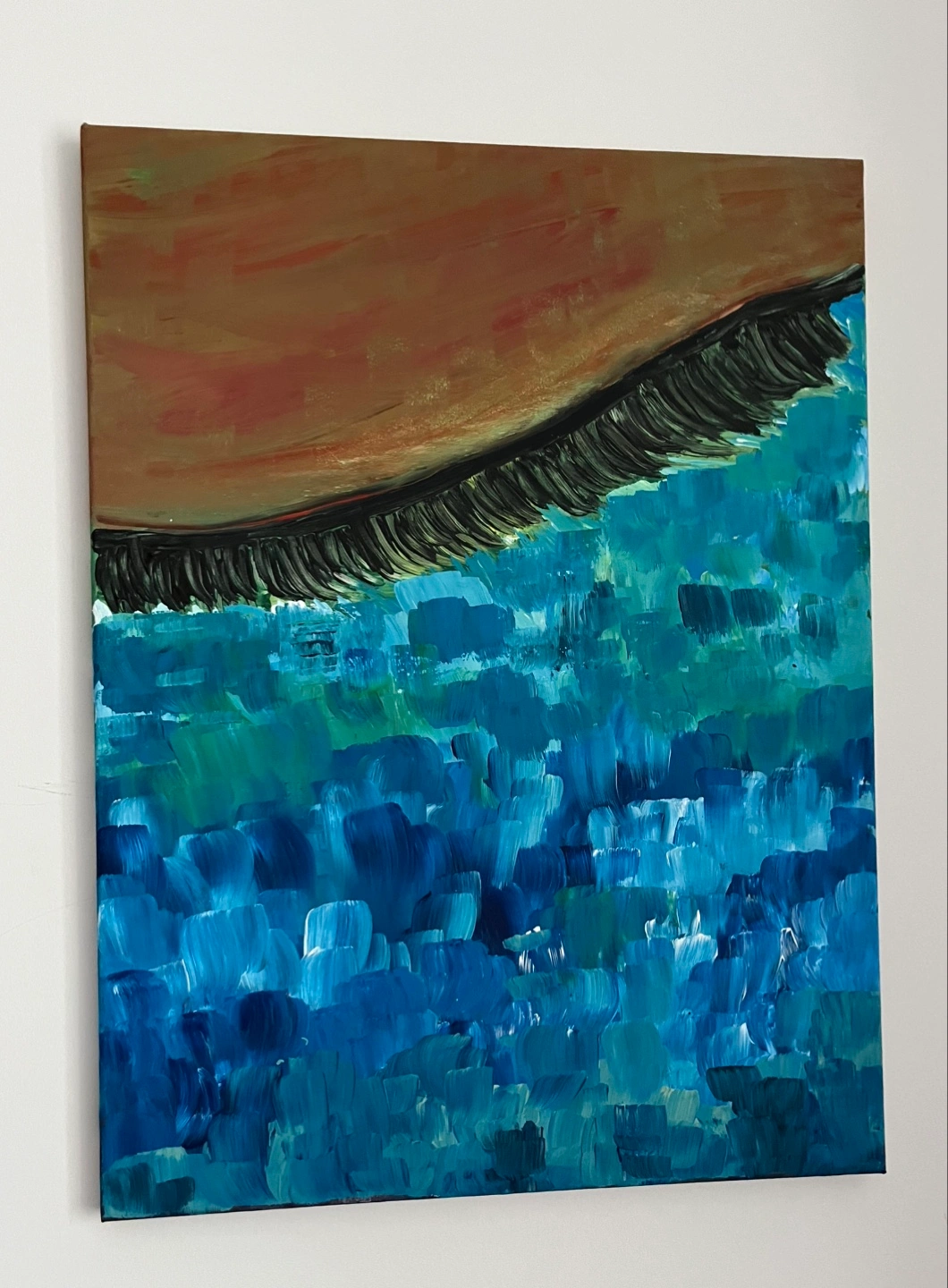 A beautiful acrylic painting on canvas. Features an abstract design. Painted in blue, brown, and black. The painting is mounted on a wooden frame, ready to hang and would be a great addition to any room to add some tranquil vibes. Cash and pickup only, please.