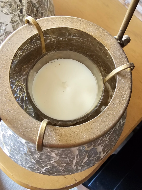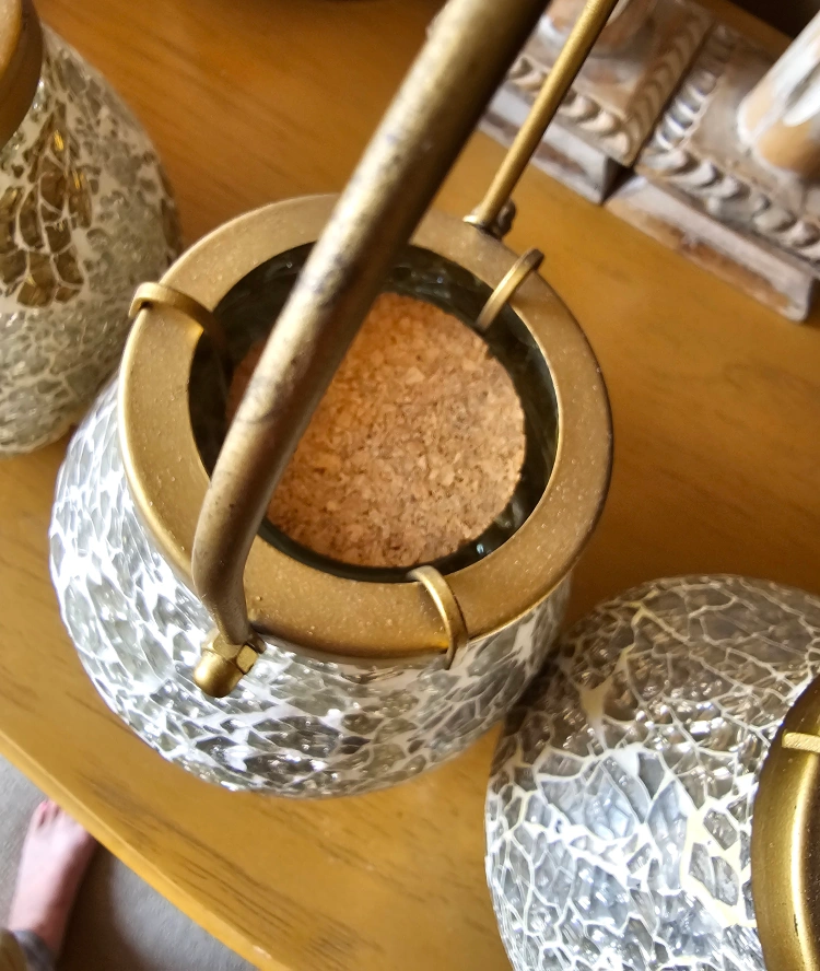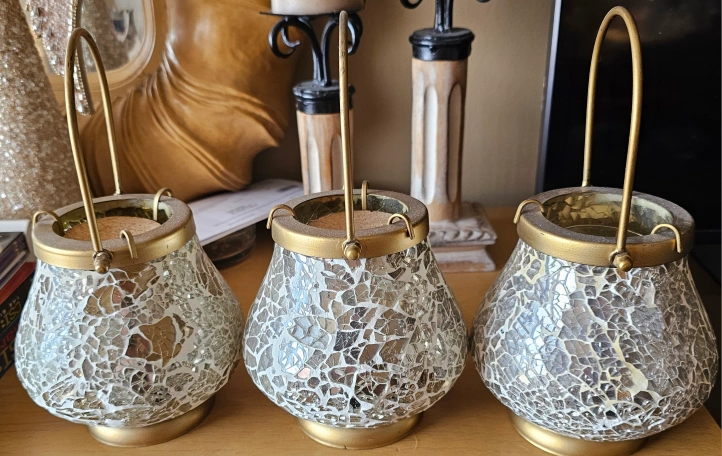 Three candle holders. The glass has a mosaic pattern. The frames and handles are a brassy gold colour. The handles go to the top. You can use them for a cozy evening at home. Includes candles .