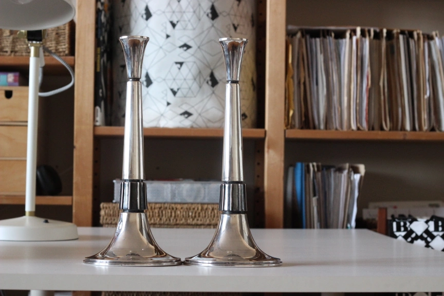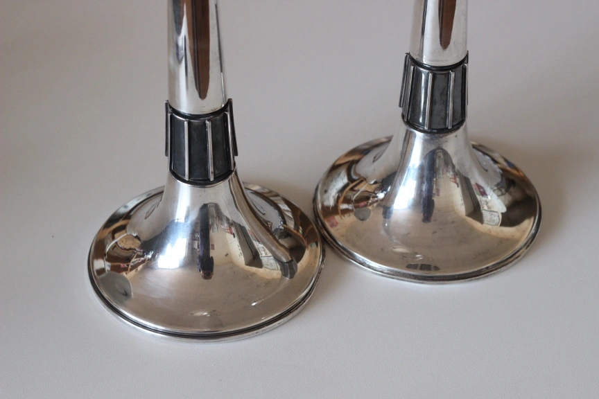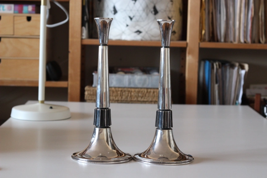 Large Sterling Silver candle holders. Artisan made in The late 1950's. True MCM. Bought as a gift for my mother’s 1960 wedding. The dark bands are the same sterling silver, left oxidized for contrast effect. 👉 Please read entire description and see all 10 📷 photos. They come with aluminum caps (a total of 4, so there are 2 spares) that sit on the top to hold the candle, collect any wax drips, and protect the silver. Photos 📷 show tops with and without the liners. • 11.75" tall, base 5" wide. • Weight: 232 g each (NOT including the tin liners). One weighs 232g (this is the intact one). The other one weighs 230g, with its (detached) silver liner (this is the damaged one). It also has a tiny bit of wax loose inside and the 230g includes this. • Stamped “STERLING, Made in Israel”. • Condition: These have been loved and used. There are a few small dings, and one candlestick has damage to the top (see photos 📷). The inner liner has detached (I have it and will provide it). This is not visible when in use with the liners and doesn't affect function, but would be nice to repair it eventually to restore them to perfection. 👉 Pick up from Yonge & St Clair