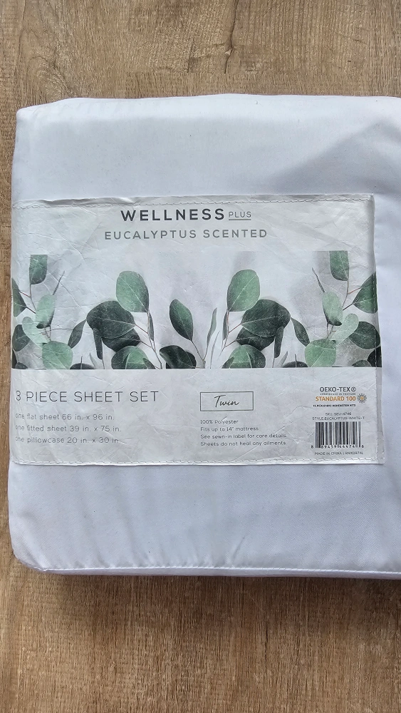 A new, unopened, 3-piece sheet set. Includes a flat sheet, fitted sheet, and a pillowcase. The sheets are eucalyptus scented. These sheets can help you create a space for peaceful rest and relaxation.