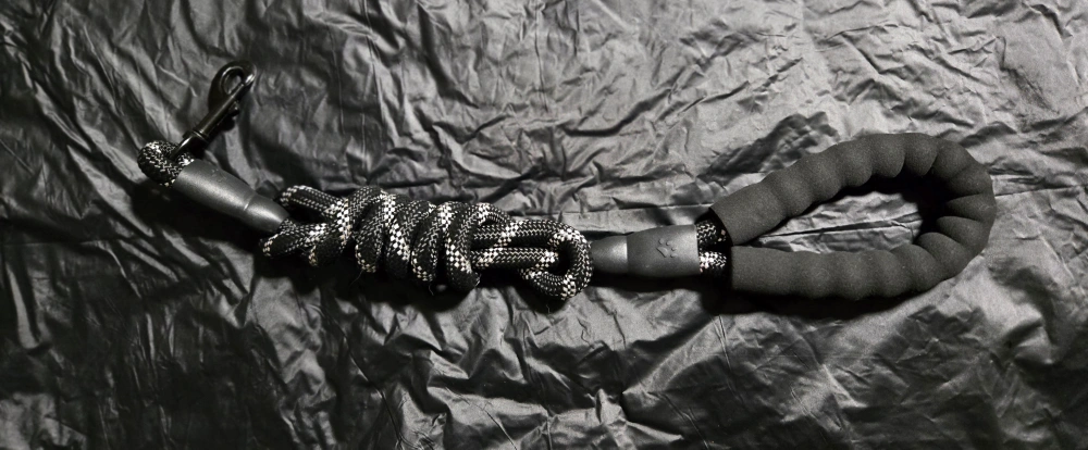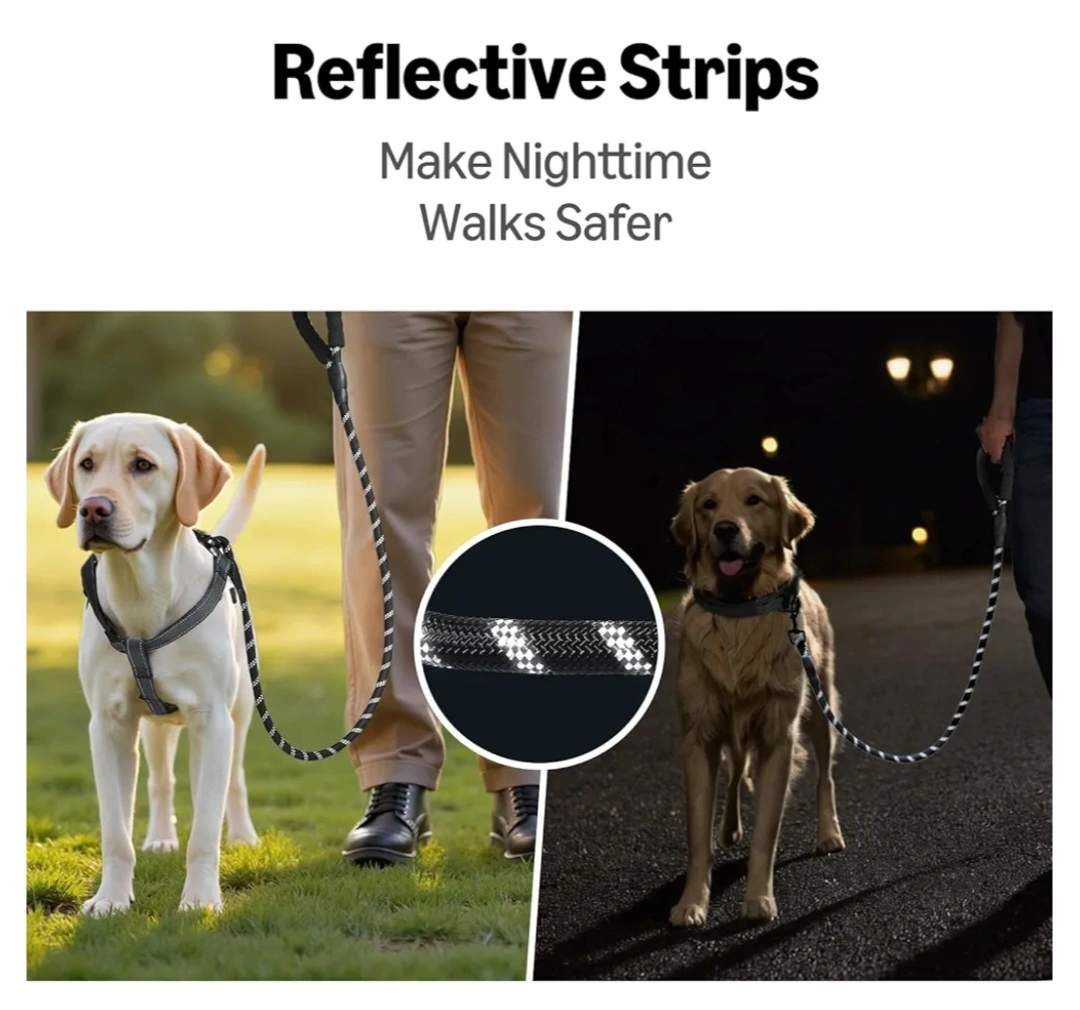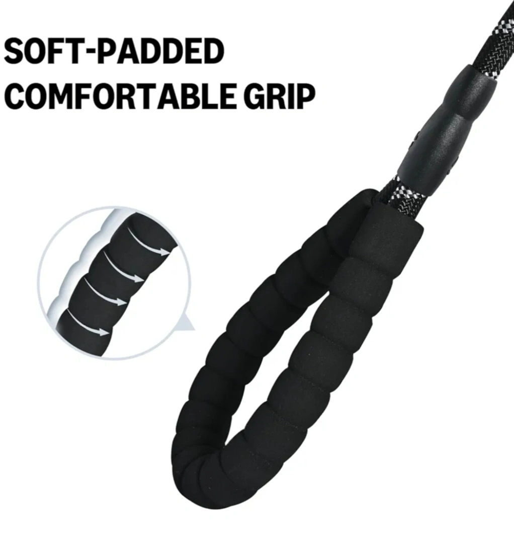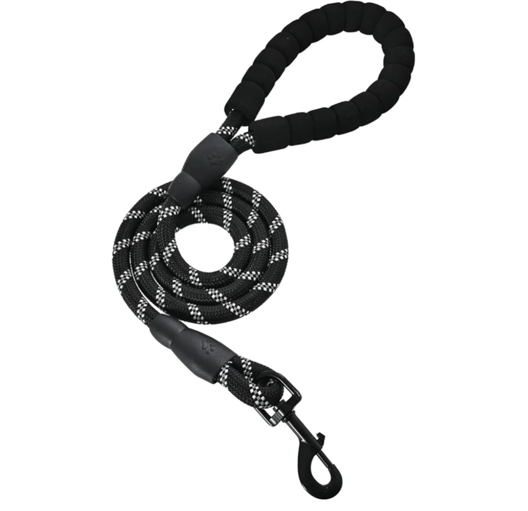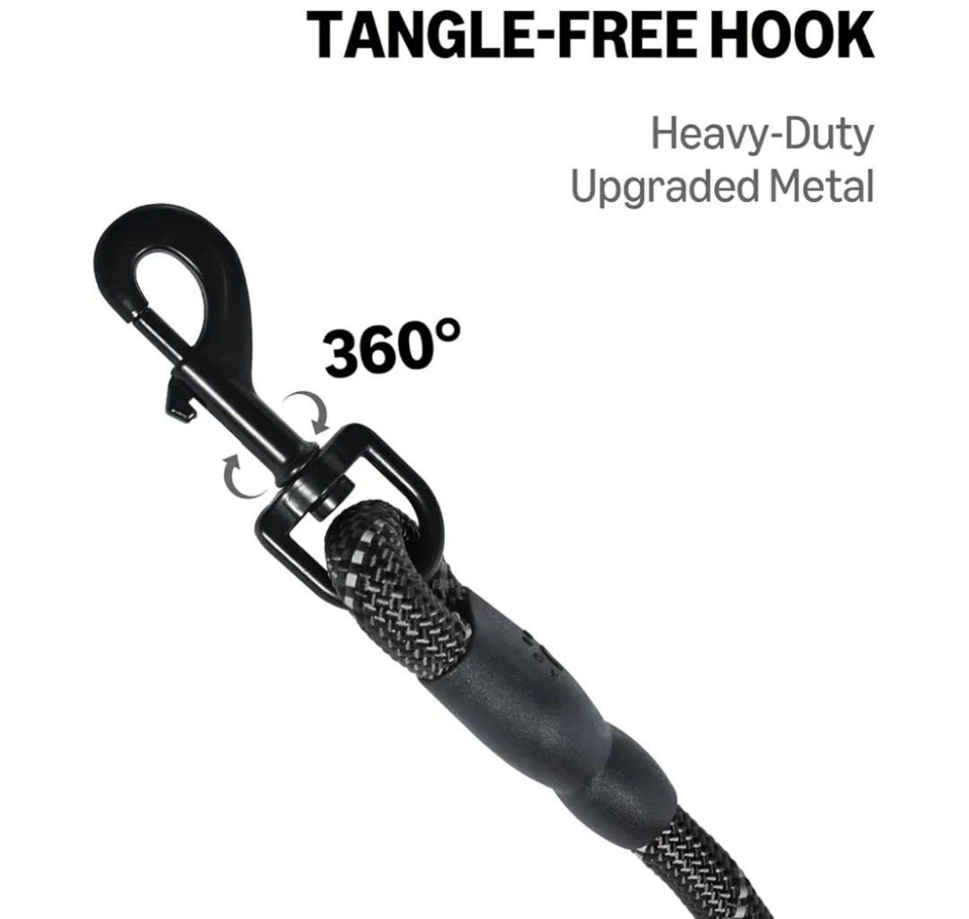 A dog leash. Features a soft-padded grip for extra comfort. Equipped with a tangle-free hook. This leash will give you a sense of calm and control during your walks.