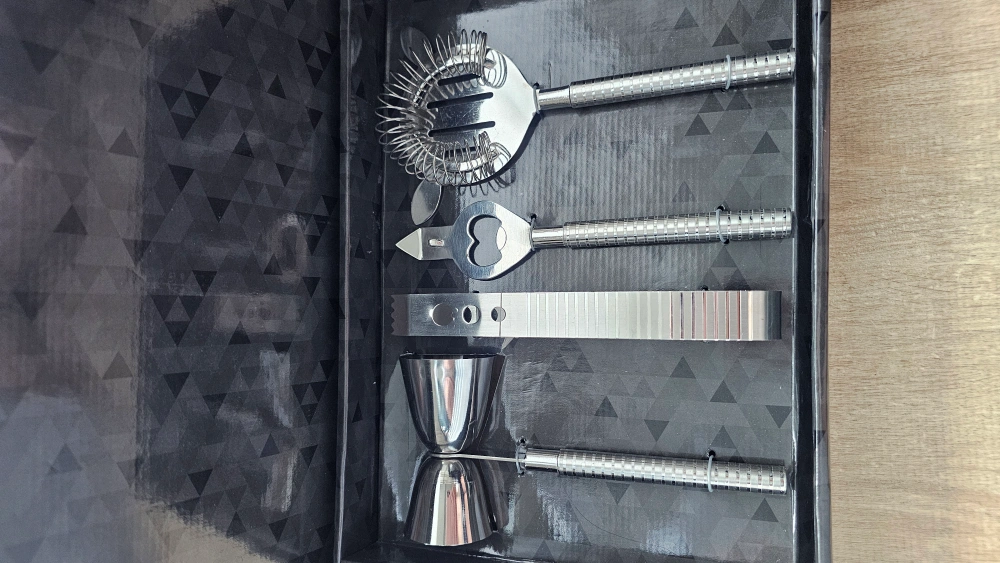 Includes various stainless steel bar tools. All tools appear to be neatly arranged in a black box. The set contains tools for mixing cocktails. Consider mixing a cocktail for your own relaxation.