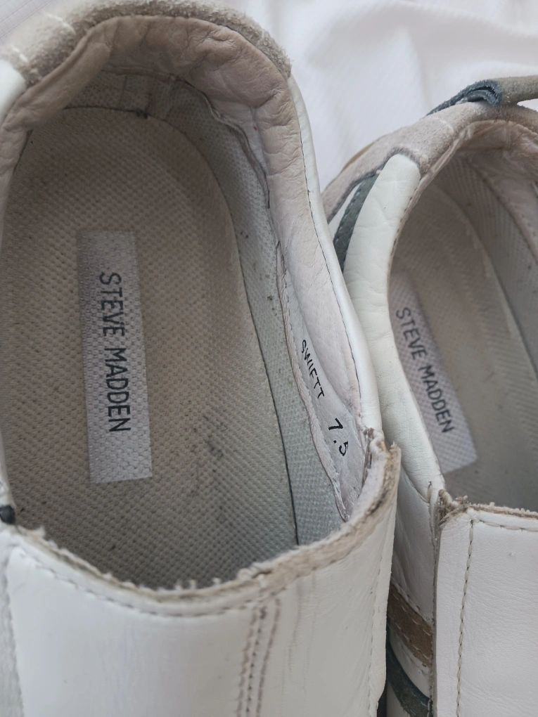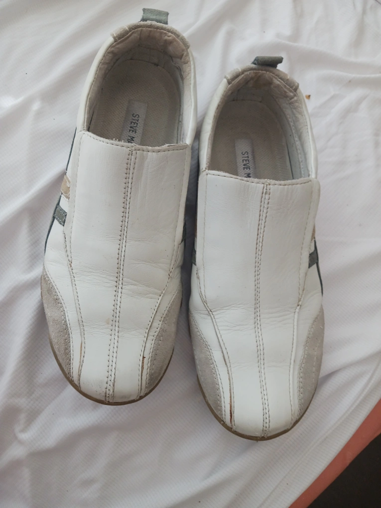 White sneakers. Appear to be slip-on style. Leather tops. The shoes are a great choice for a casual day out, providing both comfort and style. Worn only 4-5 times. Originally $120. Pick up only.