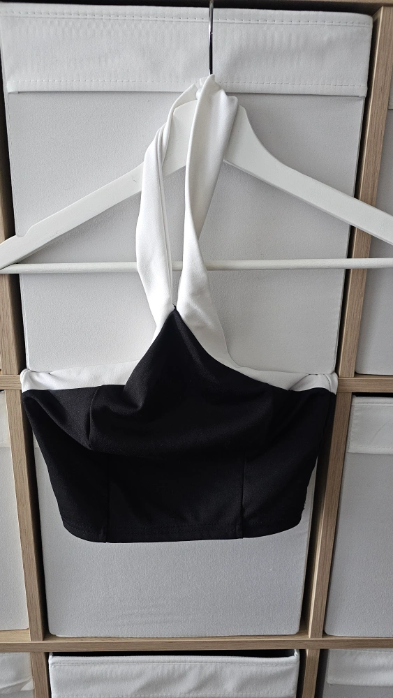 A black and white halter top. Features a halter neckline. A versatile piece. Perfect for adding a touch of elegance to your wardrobe, or simply to get you ready for an evening out.