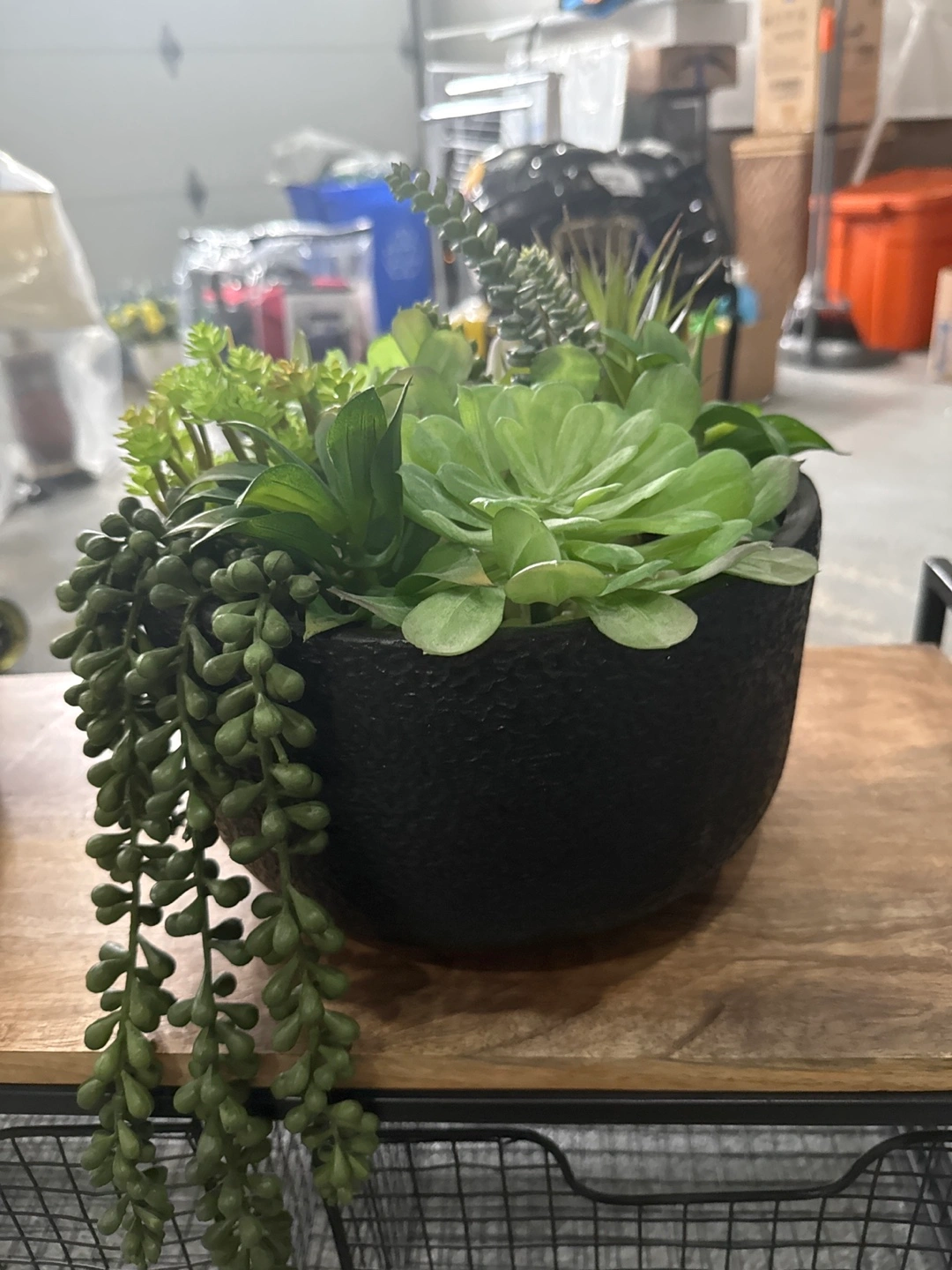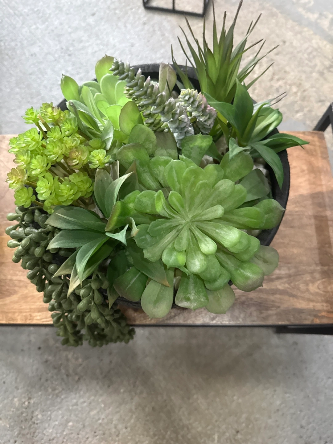 Succulent arrangement in a black, textured pot. Assortment of green plants. Perfect for any space to provide a tranquil and inviting feel.