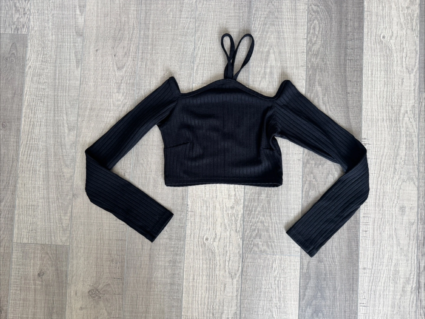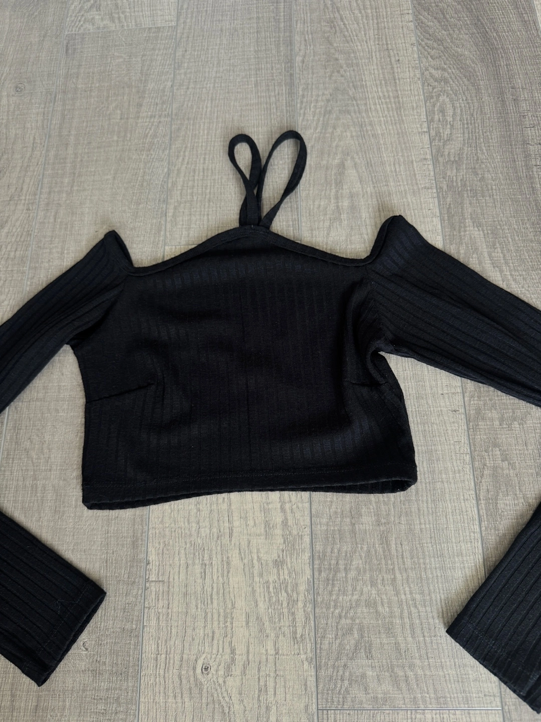 A stylish black crop top. Features long sleeves with open shoulders. A halter style neckline, ribbed design, and a cropped length. A great addition to any wardrobe for a night out.