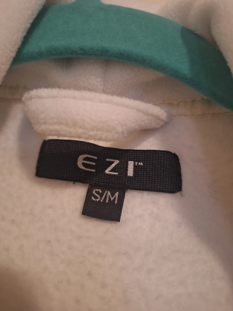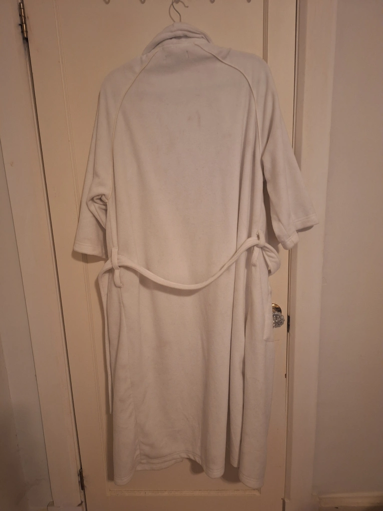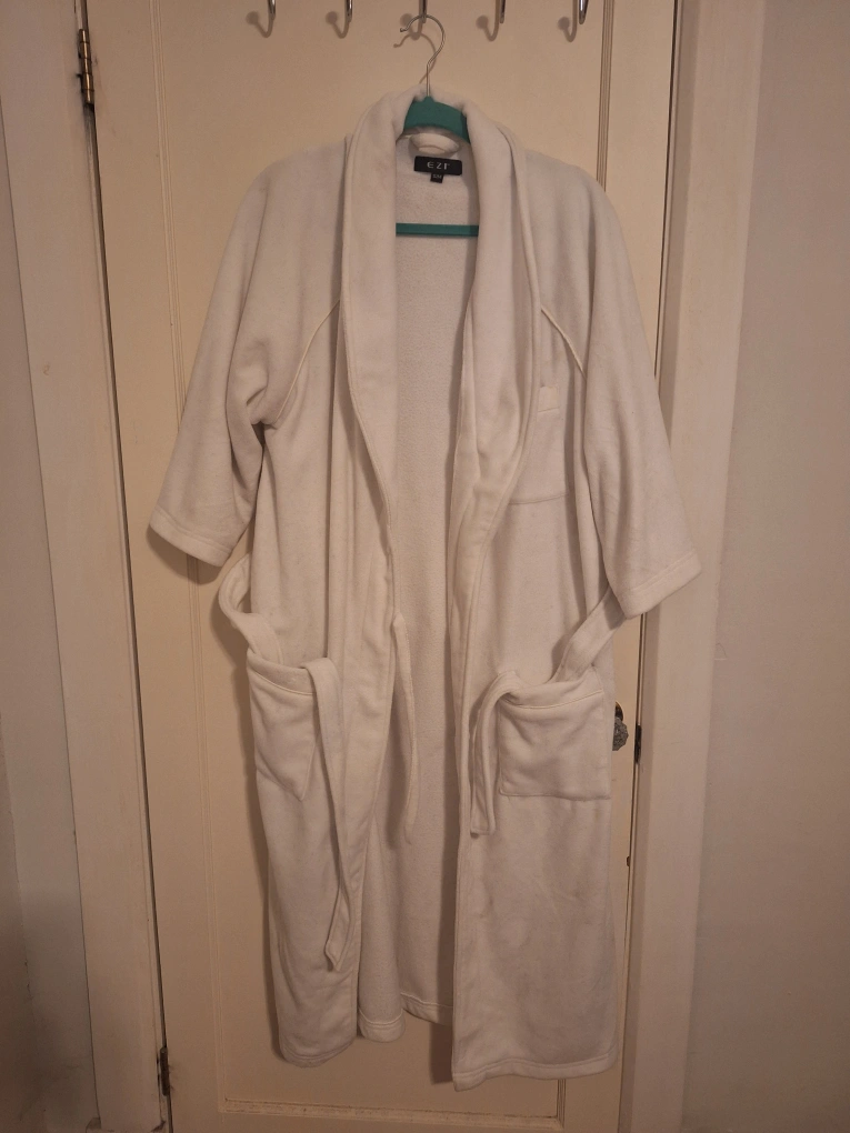 EZI brand white bath robe with fluffy & comfy texture. Size S/M for adults. A long length with pockets and a belt. Good for both men & women from 5'3" tall up.