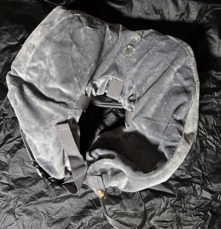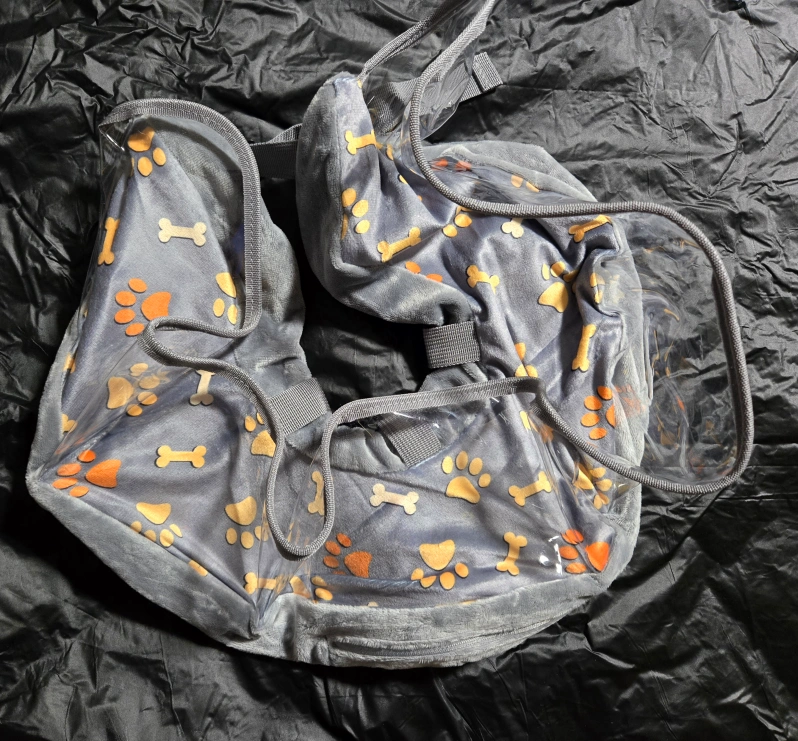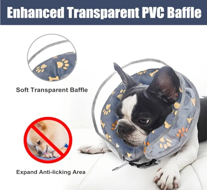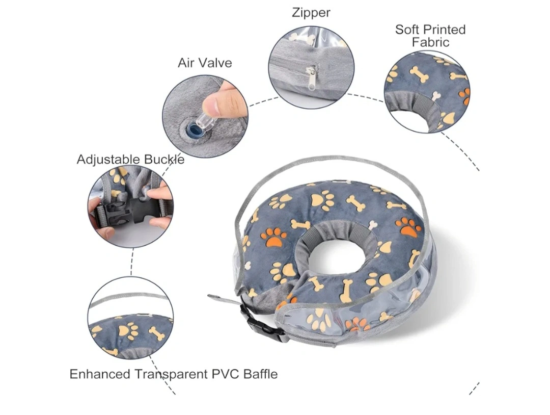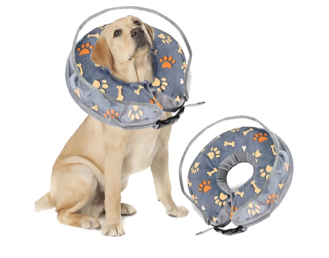 A cozy grey inflatable pet recovery collar. Features a see-through section for easy visibility. Great to help your pet comfortably recover from injury or surgery.