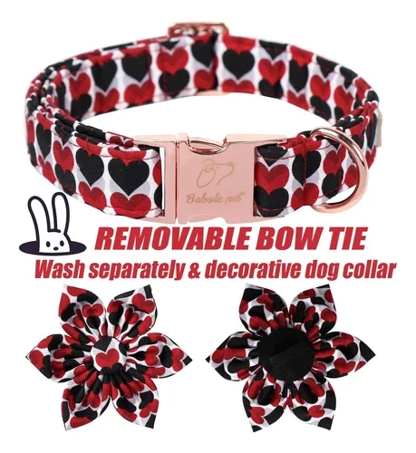 The collar features a pattern of hearts and includes a removable bow tie. It has a rose gold coloured buckle, and a D-shaped metal ring for leash connection.
