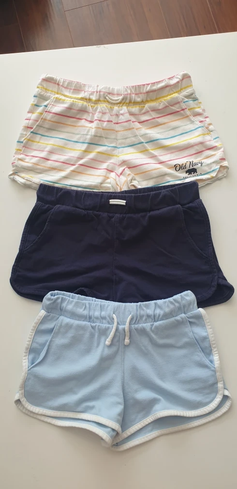 Three pairs of shorts, various colours. Elastic waistbands with drawstring. A perfect way to keep cool on a hot day.