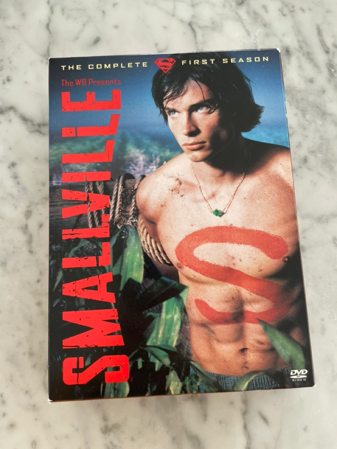 A DVD set with a cover featuring a man. The title says "Smallville", along with "The Complete First Season". The inner contents include several DVDs. It is a great item to watch on a quiet night in, to unwind.