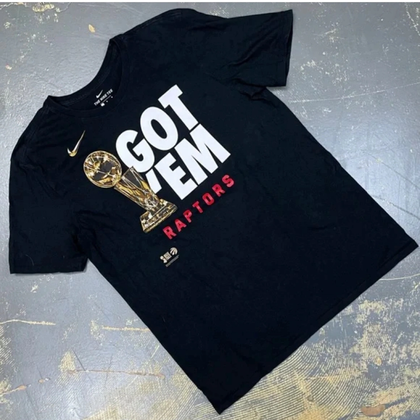 Black t-shirt. Design features the words "Got Em" and "Raptors". It also has a trophy and Nike logo. It would be a perfect addition to your collection.