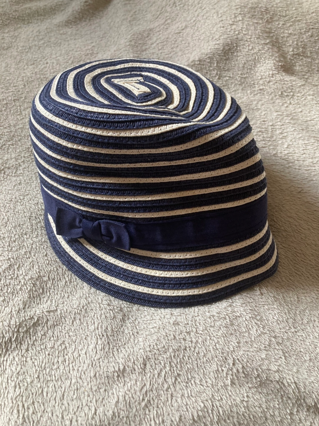 A navy blue and white striped hat. Features a navy blue ribbon around the base of the hat. A great addition to any summer outfit, which will make you feel stylish and protected from the sun.