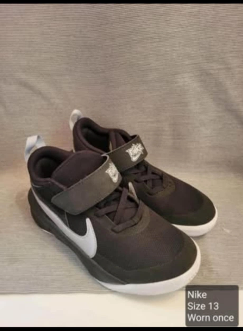 These dark-coloured sneakers have a white swoosh on the side. They have a strap that goes over the laces. Comfort and style, these shoes would be great for everyday wear. Size 13 , worn once