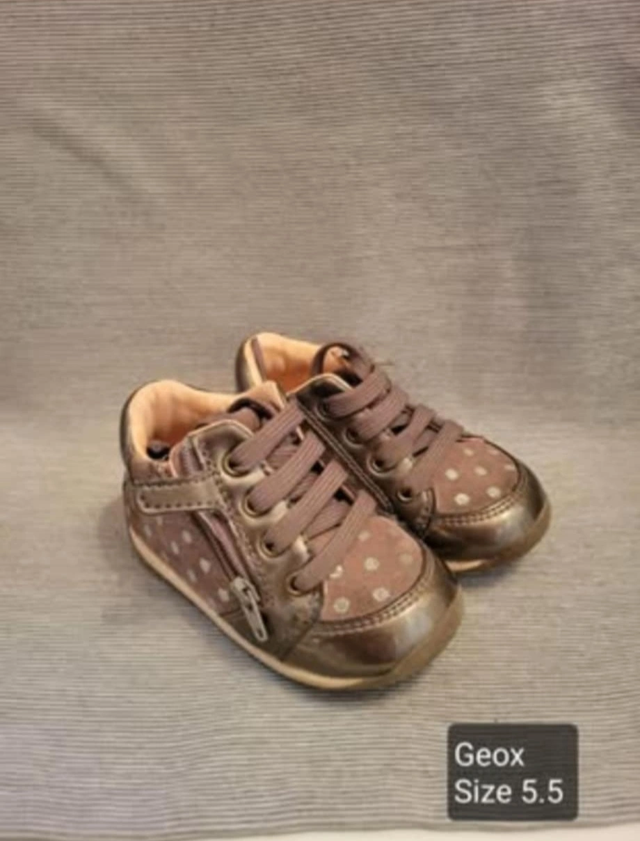 These sneakers come in brown and pink with polka dots. There is a zipper on the side. Used inside , excellent condition. Size 5.5 toddler