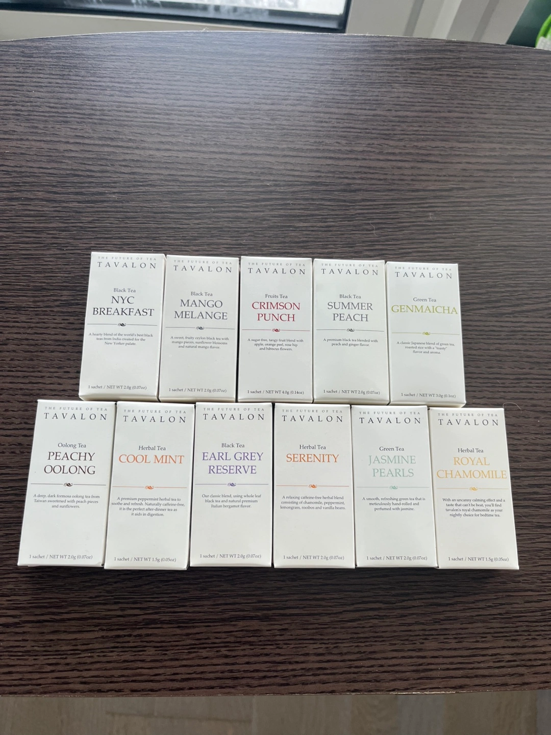 An assortment of tea sachets in a variety of flavours. Black, fruits, green, herbal etc. 1 sachet each, 11 total