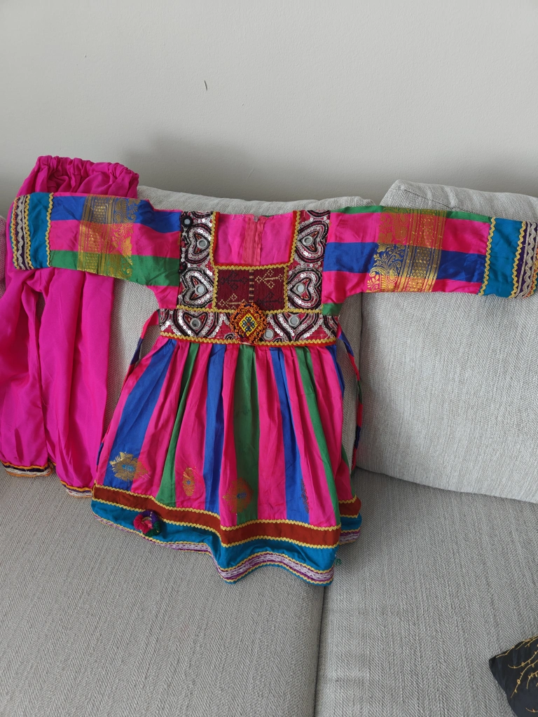 Beautiful Afghan dress. Features a vibrant mix of colours. Detailed with embroidery, sequins, and beadwork. Comes with matching pants. A great item to wear for special occasions or celebrations.
