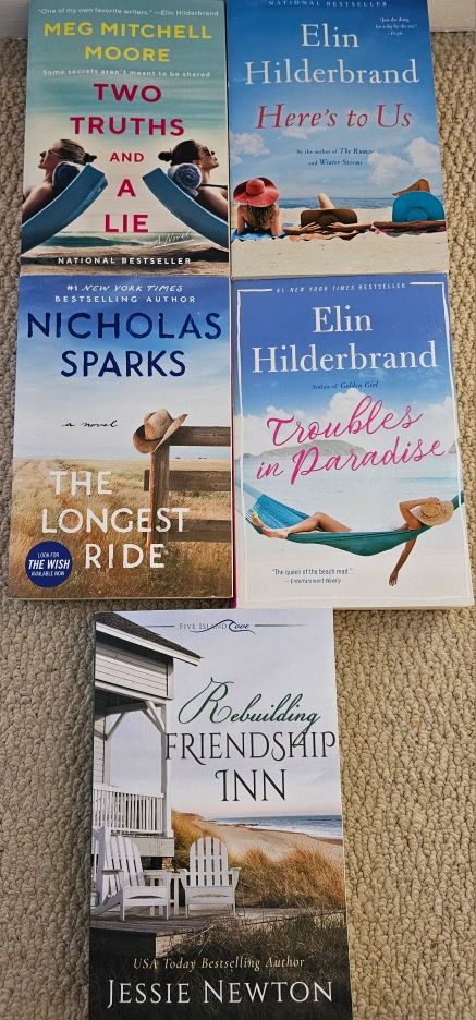 I am offering a collection of new fiction novels. Books with colourful covers. Perfect for a relaxing day by the pool. $40 for the 5 of them. obo.