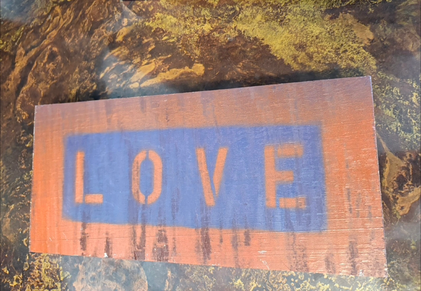A wooden panel with a stencil message. The word LOVE is stenciled on a blue background with an orange frame. This would make a wonderful decorative piece to brighten up a room.
