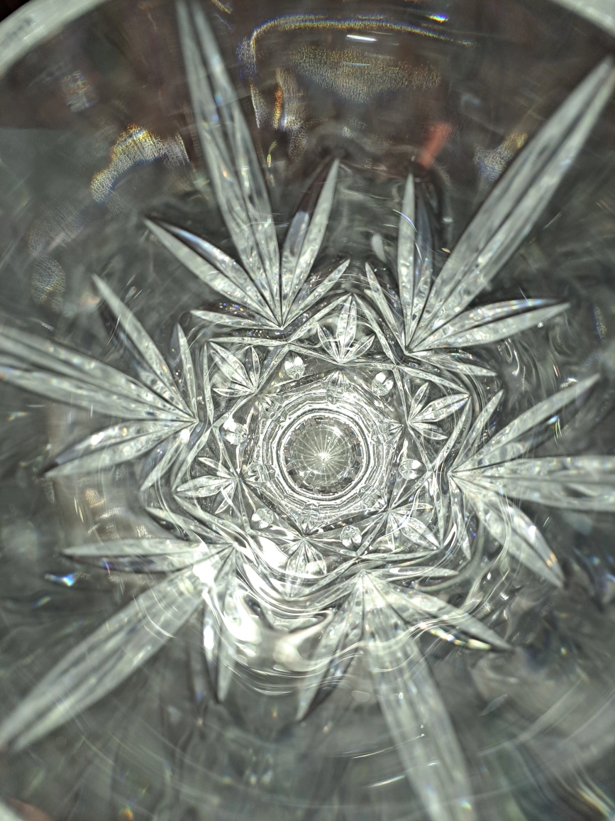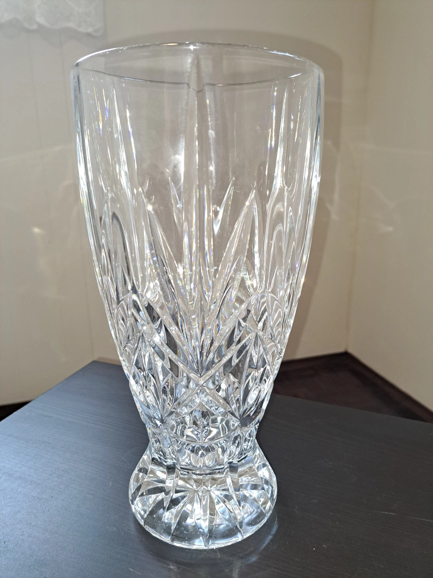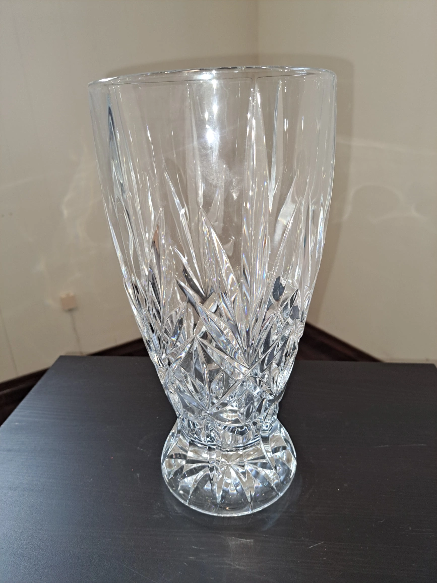 A beautiful crystal vase. Clear glass with intricate detailing. Perfect for displaying your favourite flowers, which will surely bring peace to your home. non smoking home cash only