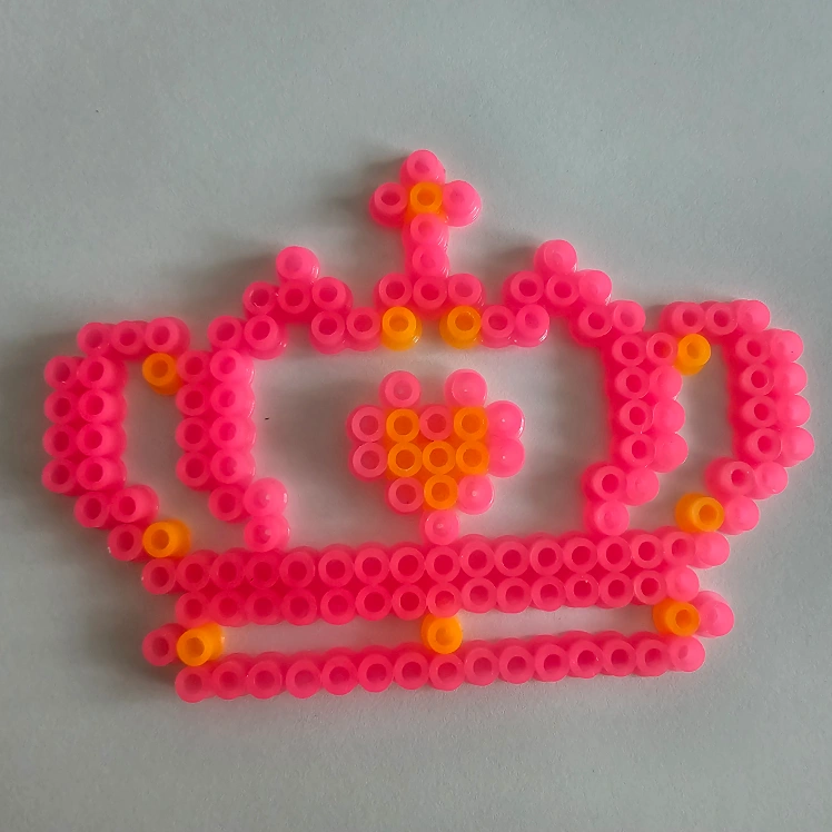 A pink crown shape. Adorned with orange accents. A fun piece for decor. This crown could be used to decorate a room or for crafting.