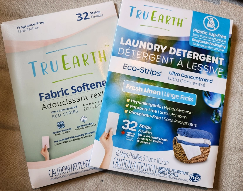 I'm selling a couple of boxes of Tru Earth laundry products. One is laundry detergent, and the other is fabric softener, both in strip form. The laundry detergent is the Fresh Linen scent. They're great for keeping your laundry smelling fresh and clean, and for adding that extra layer of comfort to your clothes.