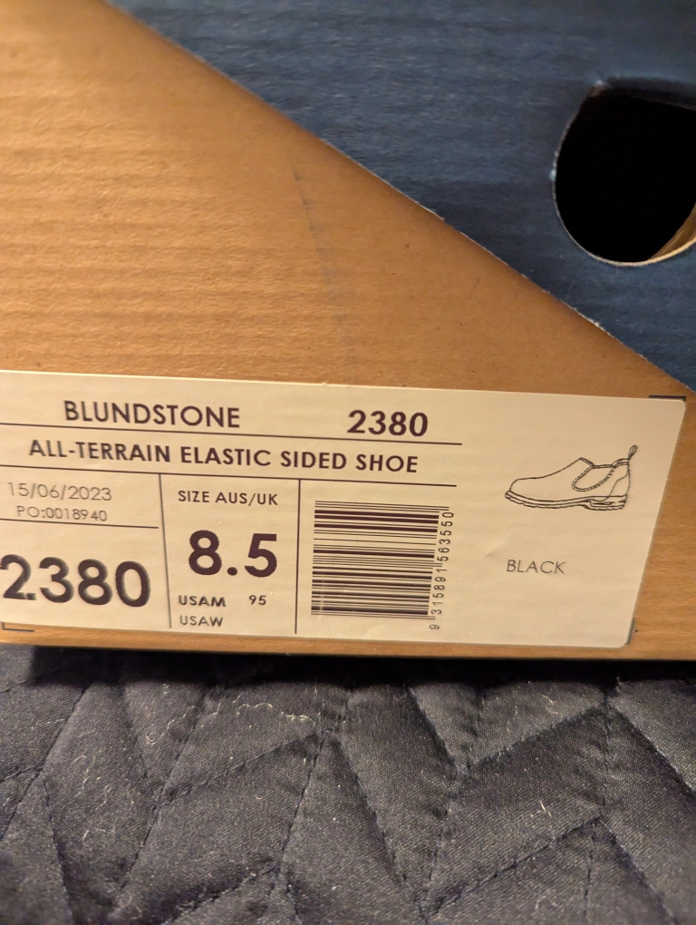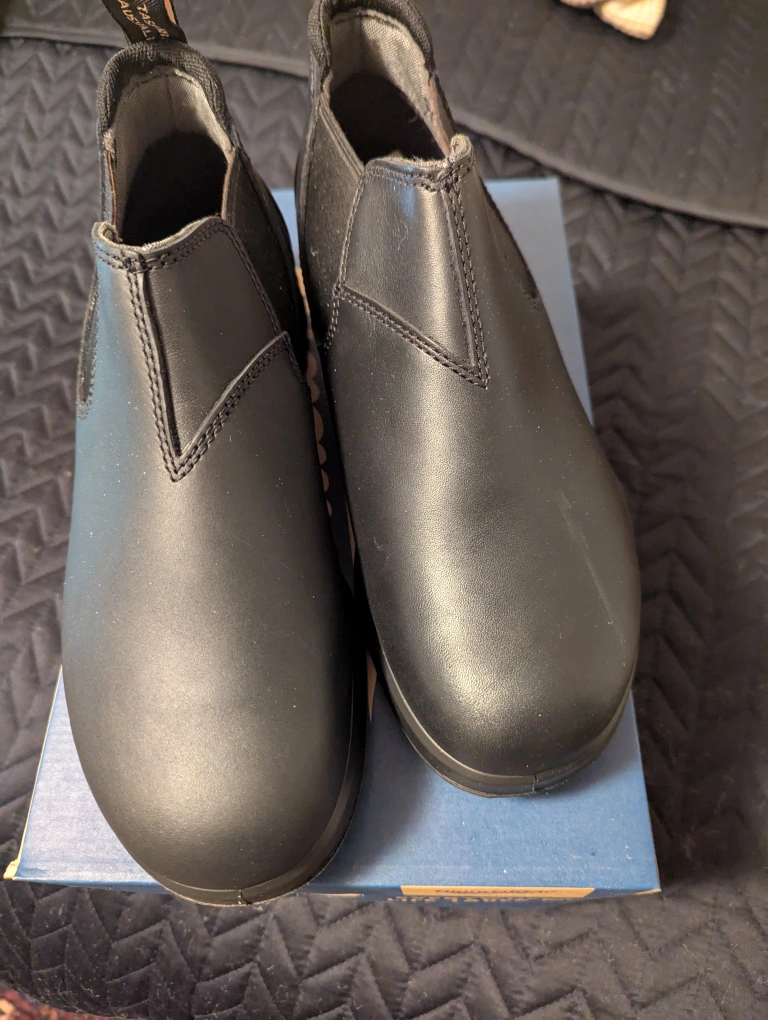 Brand new pair of men's Blundstone elastic sided shoe in black, size 8.5 UK/9 .5 US. Brand new in box with extra insoles. Retails at $269.00, plus taxes.