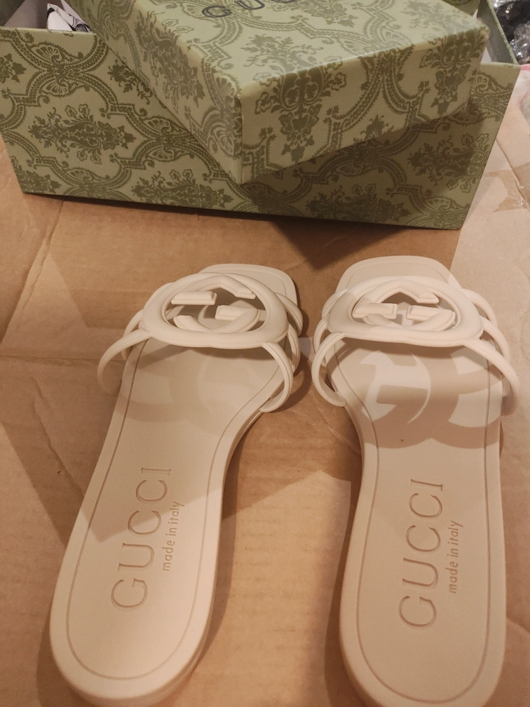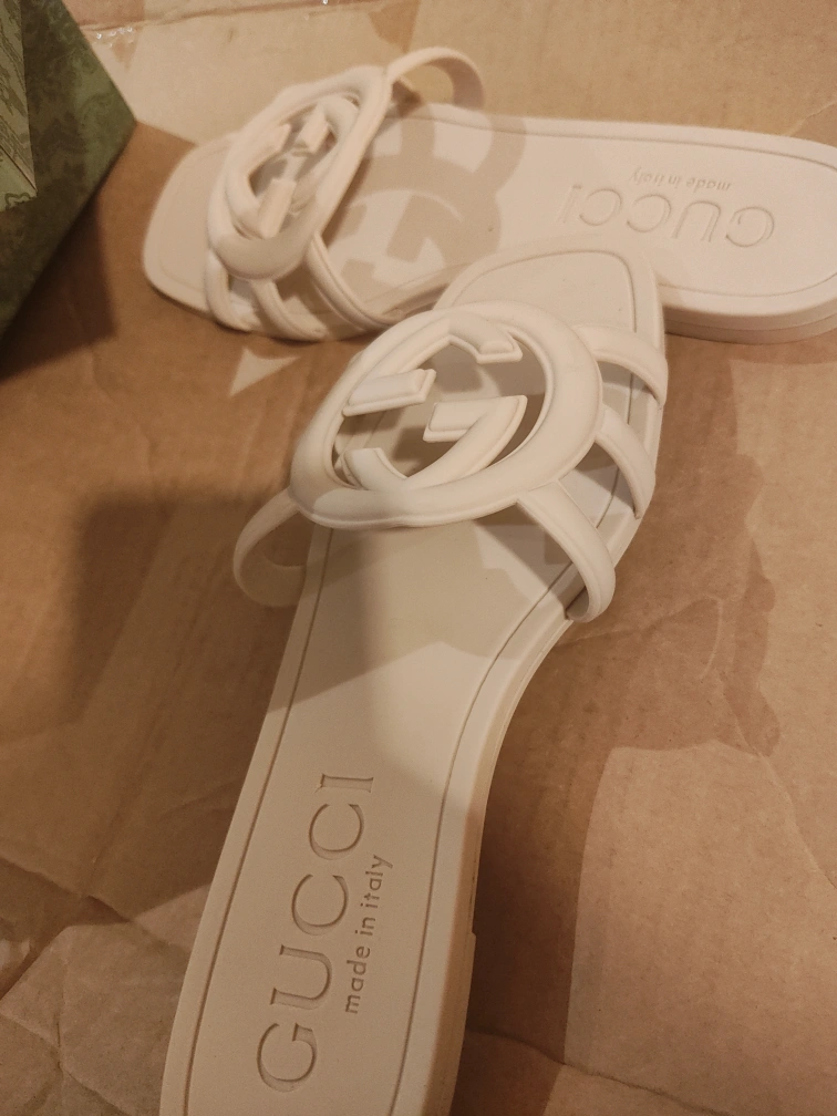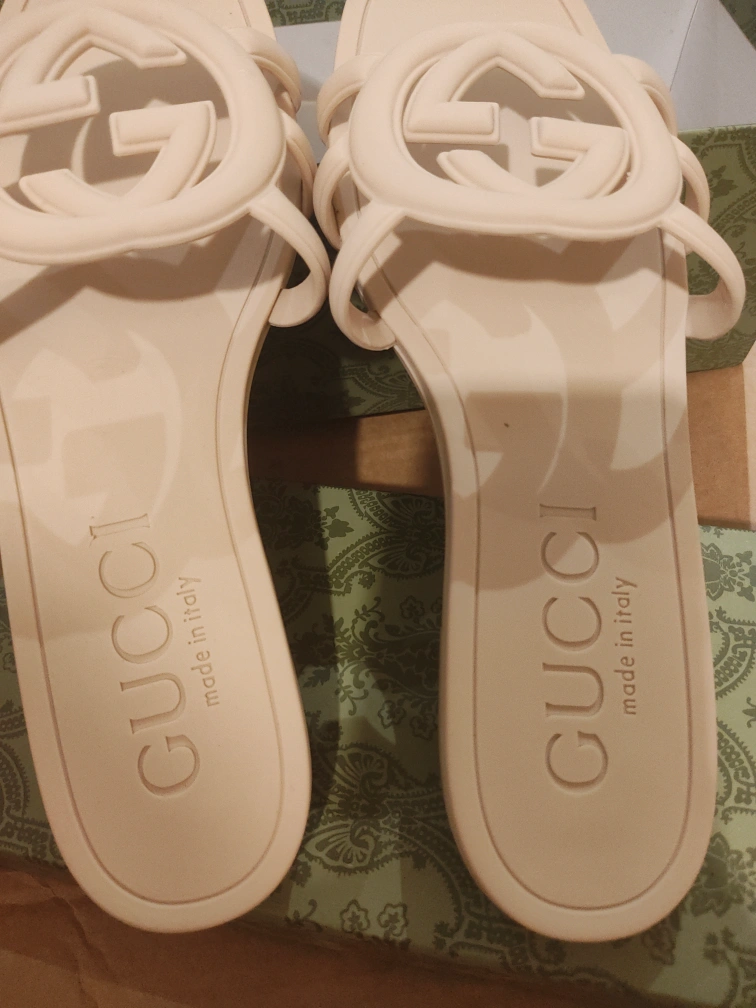 Slides in an off-white colour. Made in Italy. Features the interlocking G logo. They would be lovely to wear on vacation.