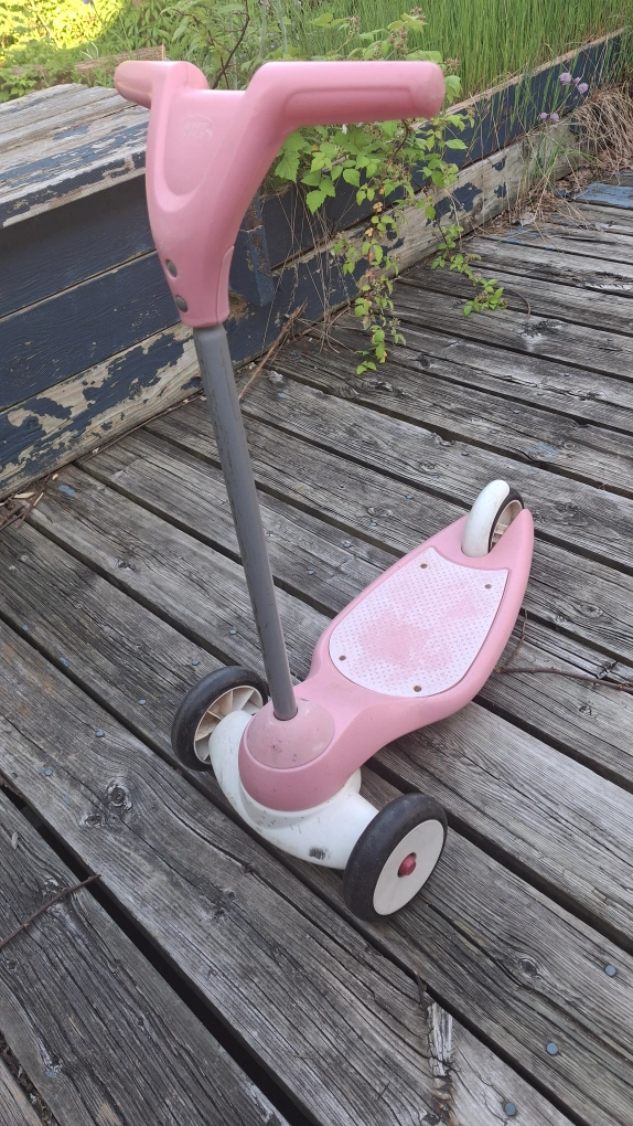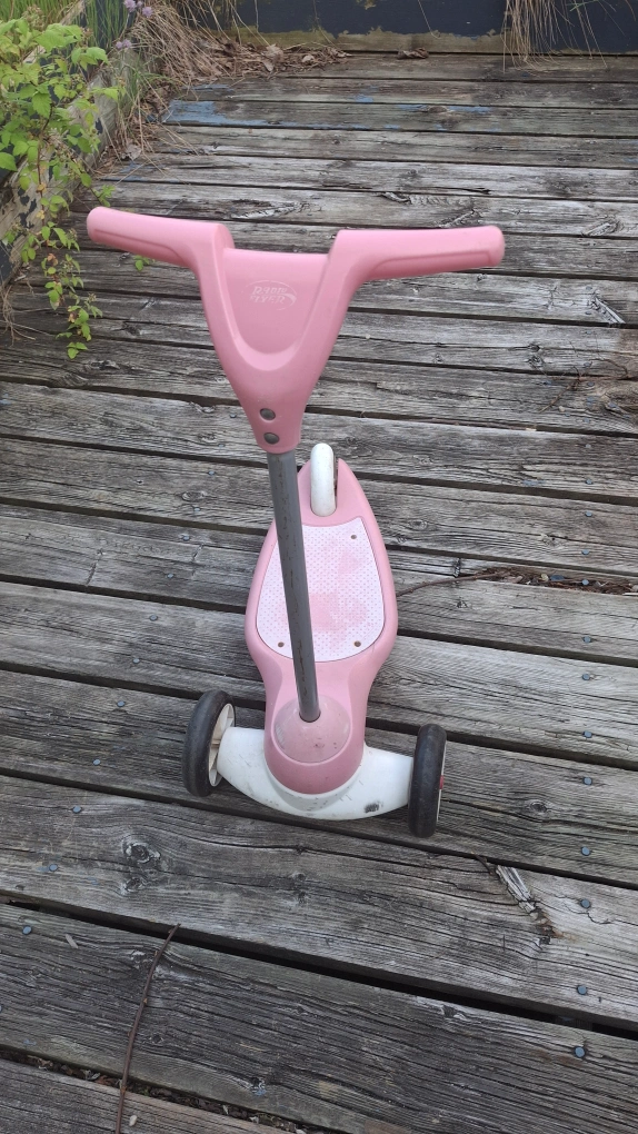 A pink coloured scooter. It has a handle and a footboard. The wheels are black and white. What a great way to get around outside.