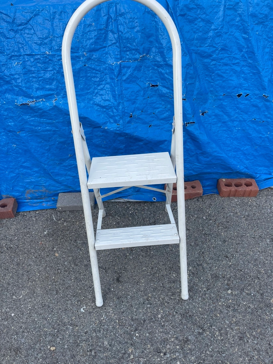 White, two-step folding step stool. Includes a top handle for extra support. Perfect for accessing those hard to reach places, take a deep breath and see how it fits your needs so perfectly.