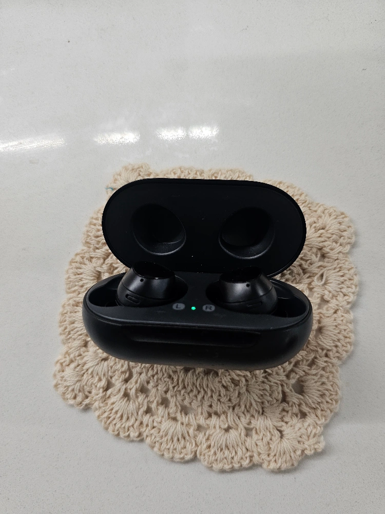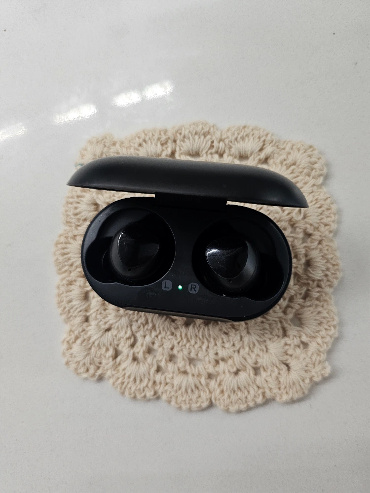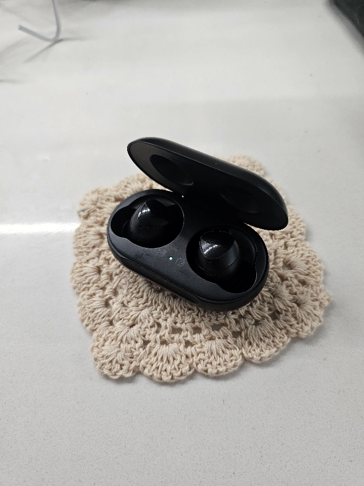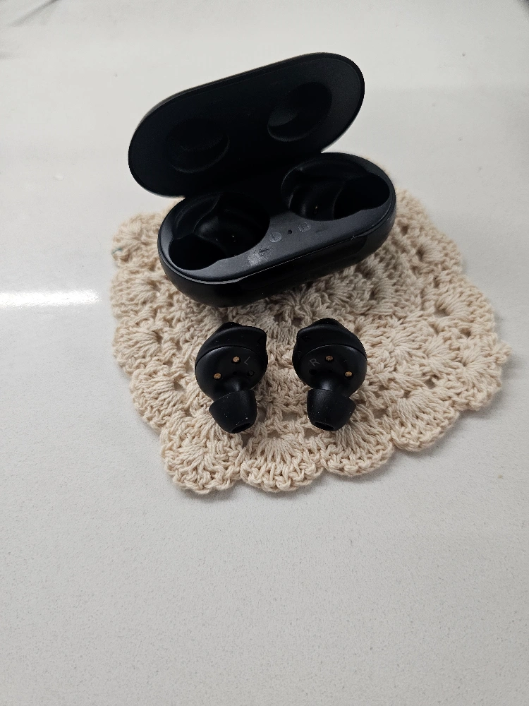 Stylish wireless earbuds in black. Comes with a charging case. Enjoy listening to music with these comfortable earbuds and let your stress melt away. The earbuds are wireless. I am using headphones 🎧